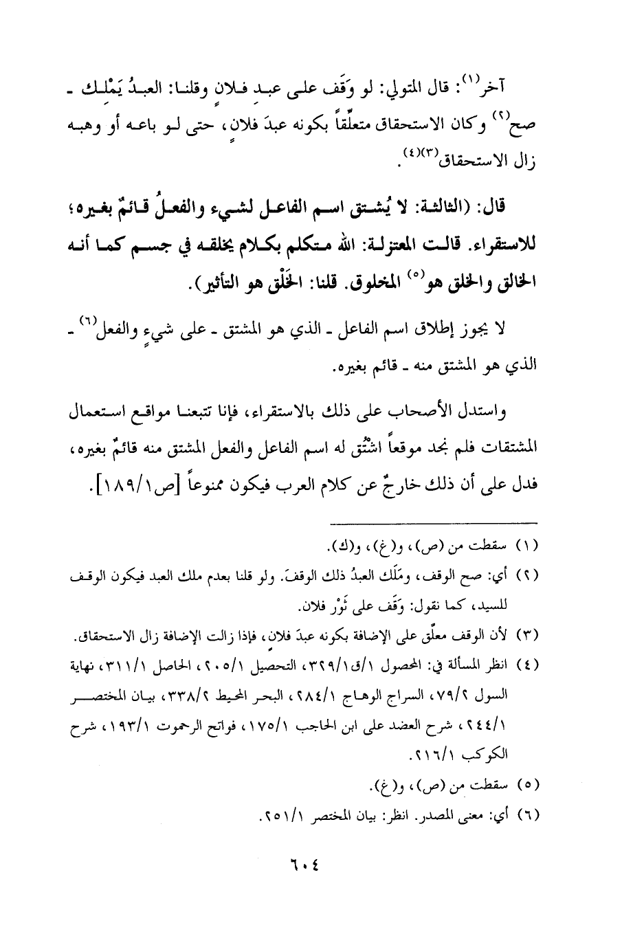 واستدل الأصحاب على ذلك بالاستقراء، فإنا تتبعنا مواقع استعمال المشتقات فلم نجد موقعًا اشْتُق له اسم الفاعل والفعل المشتق منه قائمٌ بغيره، فدل على أن ذلك خارجٌ عن كلام العرب فيكون ممنوعًا.