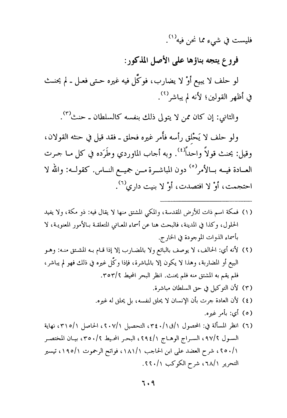 (¬٢) لأنه أي: الحالف، لا يوصف بالبائع ولا بالمضارب إلا إذا قام به المشتق منه: وهو البيع أو المضاربة، وهذا لا يكون إلا بالمباشرة، فإذا وكَّل غيره في ذلك فهو لم يباشر، فلم يقم به المشتق منه فلم يحنث. انظر البحر المحيط ٢/ ٣٥٣.