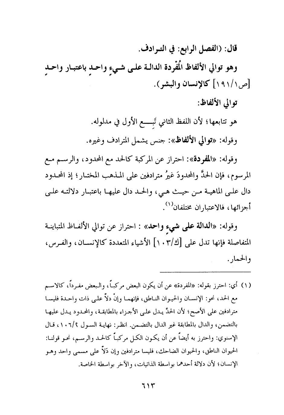 وقوله: "المفردة": احتراز عن المركبة كالحد مع المحدود، والرسم مع المرسوم، فإن الحدَّ والمحدودَ غيرُ مترادفين على المذهب المختار؛ إذ المحدود دال على الماهية من حيث هي، والحد دال عليها باعتبار دلالته على أجزائها، فالاعتباران مختلفان (¬١).