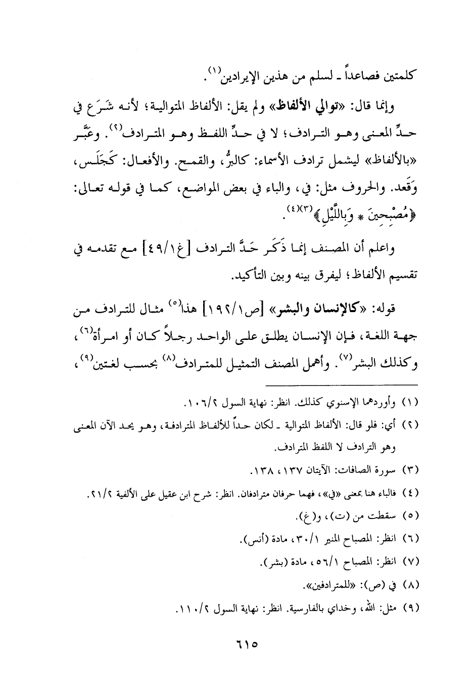 وإنما قال: "توالي الألفاظ" ولم يقل: الألفاظ المتوالية؛ لأنه شَرَع في حدِّ المعنى وهو الترادف؛ لا في حدِّ اللفظ وهو المترادف (¬٢). وعَبَّر "بالألفاظ" ليشمل ترادف الأسماء: كالبرُّ، والقمح. والأفعال: كَجَلَس، وَقَعد. والحروف مثل: في، والباء في بعض المواضع، كما في قوله تعالى: {مُصْبِحِينَ (١٣٧) وَبِاللَّيْلِ} (¬٣) (¬٤).