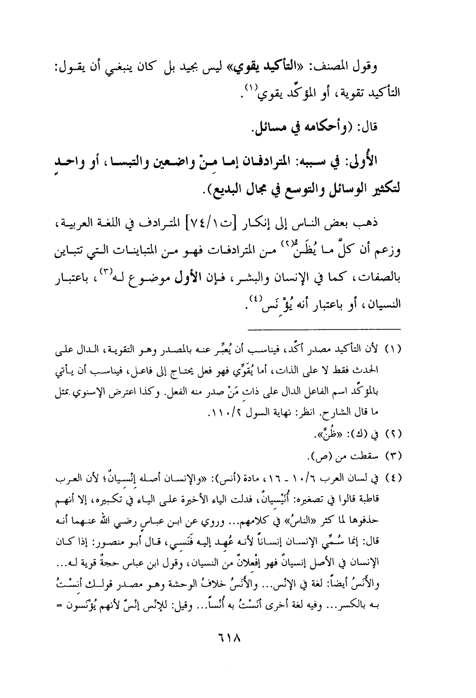 ذهب بعض الناس إلى إنكار المترادف في اللغة العربية، وزعم أن كلَّ ما يُظَنُّ (¬٢) من المترادفات فهو من المتباينات التي تتباين بالصفات، كما في الإنسان والبشر، فإن الأول موضوع له (¬٣)، باعتبار النسيان، أو باعتبار أنه يُؤْنَس (¬٤).