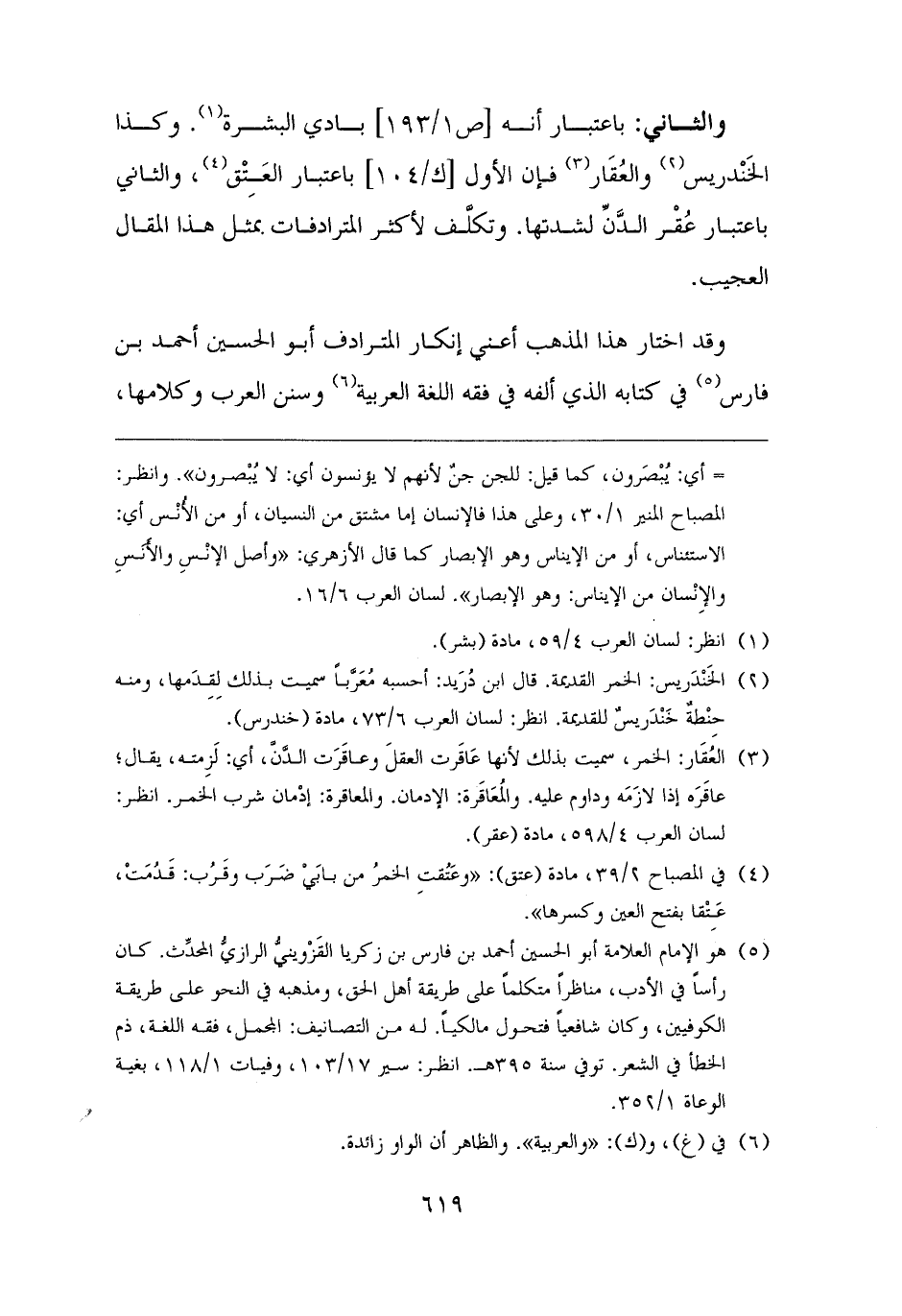 وقد اختار هذا المذهب أعني إنكار المترادف أبو الحسين أحمد بن فارس (¬٥) في كتابه الذي ألفه في فقه اللغة العربية (¬٦) وسنن العرب وكلامها،