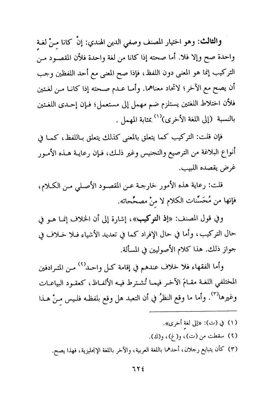 والثالث: وهو اختيار المصنف وصفي الدين الهندي: إنْ كانا مِنْ لغةٍ واحدة صح وإلا فلا. أما صحته إذا كانا من لغة واحدة فلأن المقصود من التركيب إنما هو المعنى دون اللفظ، فإذا صح المعنى مع أحد اللفظين وجب أن يصح مع الآخر؛ لاتحاد معناهما. وأما عدم صحته إذا كانا من لغتين فلأن اختلاط اللغتين يستلزم ضم مهمل إلى مستعمل؛ فإن إحدى اللغتين بالنسبة (إلى اللغة الأخرى) (¬١) بمثابة المهمل.