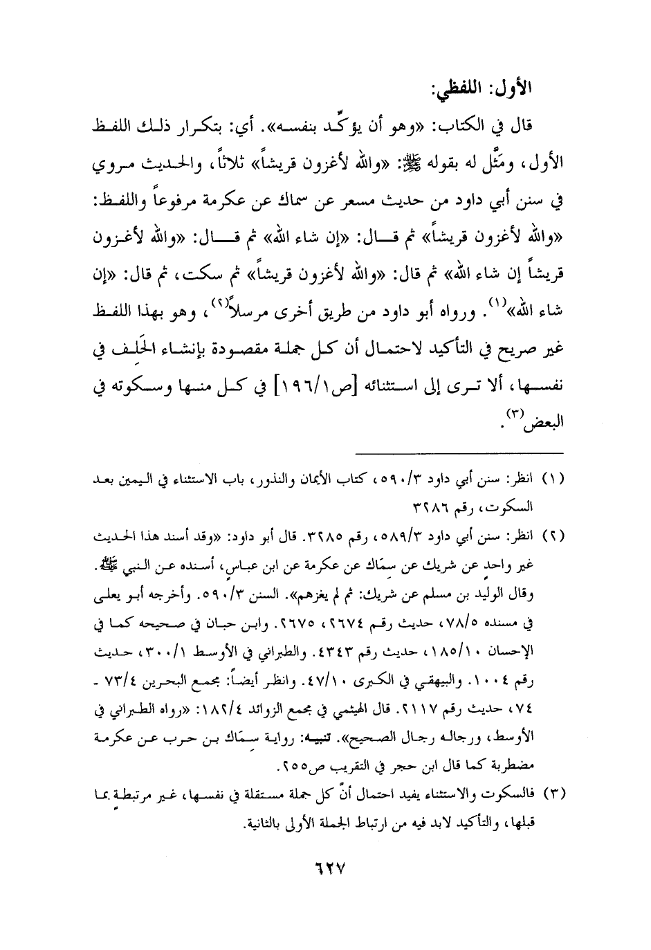 قال في الكتاب: "وهو أن يؤكِّد بنفسه". أي: بتكرار ذلك اللفظ الأول، ومَثَّل له بقوله - صلى الله عليه وسلم -: "والله لأغزون قريشًا" ثلاثًا، والحديث مروي في سنن أبي داود من حديث مسعر عن سماك عن عكرمة مرفوعًا واللفظ: "والله لأغزون قريشًا" ثم قال: "إن شاء الله" ثم قال: "والله لأغزون قريشًا إن شاء الله" ثم قال: "والله لأغزون قريشًا" ثم سكت، ثم قال: "إن شاء الله" (¬١). ورواه أبو داود من طريق أخرى مرسلًا (¬٢)، وهو بهذا اللفظ غير صريح في التأكيد لاحتمال أن كل جملة مقصودة بإنشاء الحَلِف في نفسها، ألا ترى إلى استثنائه في كل منها وسكوته في البعض (¬٣).