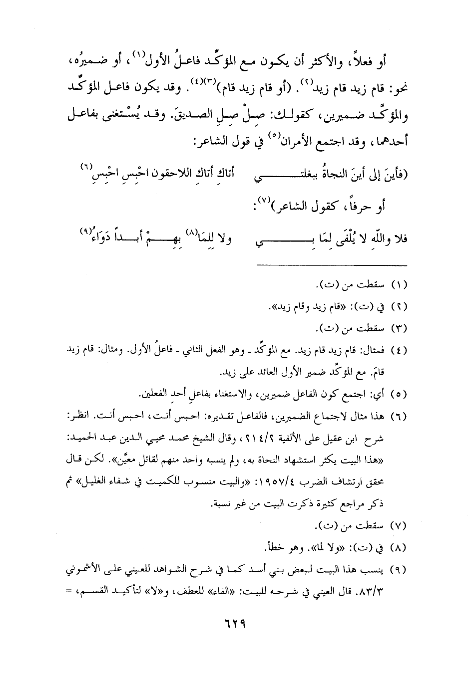 (¬٦) هذا مثال لاجتماع الضميرين، فالفاعل تقديره: احبس أنت، احبس أنت. انظر: شرح ابن عقيل على الألفية ٢/ ٢١٤، وقال الشيخ محمد محيي الدين عبد الحميد: "هذا البيت يكثر استشهاد النحاة به، ولم ينسبه واحد منهم لقائل معيَّن". لكن قال محقق ارتشاف الضرب ٤/ ١٩٥٧: "والبيت منسوب للكميت في شفاء الغليل" ثم ذكر مراجع كثيرة ذكرت البيت من غير نسبة.