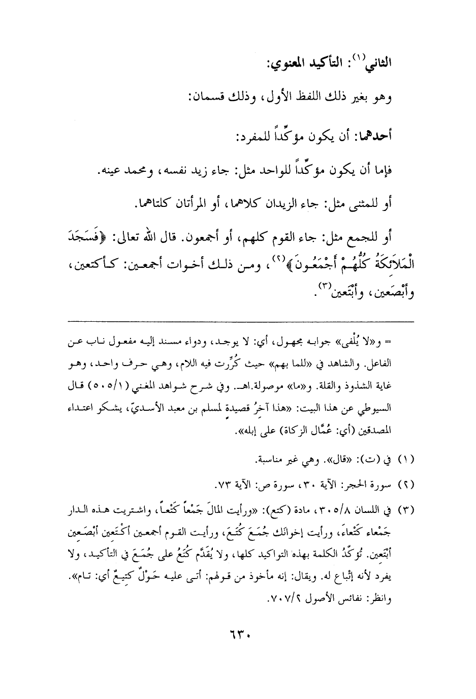 أو للجمع مثل: جاء القوم كلهم، أو أجمعون. قال الله تعالى: {فَسَجَدَ الْمَلَائِكَةُ كُلُّهُمْ أَجْمَعُونَ} (¬٢)، ومن ذلك أخوات أجمعين: كأكتعين، وأبْصَعين، وأبْتَعين (¬٣).