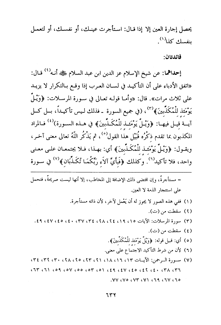 إحداهما: عن شيخ الإسلام عز الدين بن عبد السلام - رضي الله عنه - أنه (¬٢) قال: "اتفق الأدباء على أن التأكيد في لسان العرب إذا وقع بالتكرار لا يزيد على ثلاث مرات". قال: "وأما قوله تعالى في سورة المرسلات: {وَيْلٌ يَوْمَئِذٍ لِلْمُكَذِّبِينَ} (¬٣)، (في جميع السورة - فذلك ليس تأكيدًا، بل كل آية قِيل فيها: {وَيْلٌ يَوْمَئِذٍ لِلْمُكَذِّبِينَ} في هذه السورة) (¬٤) فالمراد المكذبون بما تقدم ذِكْرُه قُبَيْل هذا القول (¬٥)، ثم يَذْكُر اللهُ تعالى معنى آخر، ويقول: {وَيْلٌ يَوْمَئِذٍ لِلْمُكَذِّبِينَ} أي: بهذا، فلا يجتمعان على معنى واحد، فلا تأكيد (¬٦). وكذلك {فَبِأَيِّ آلَاءِ رَبِّكُمَا تُكَذِّبَانِ} (¬٧) في سورة