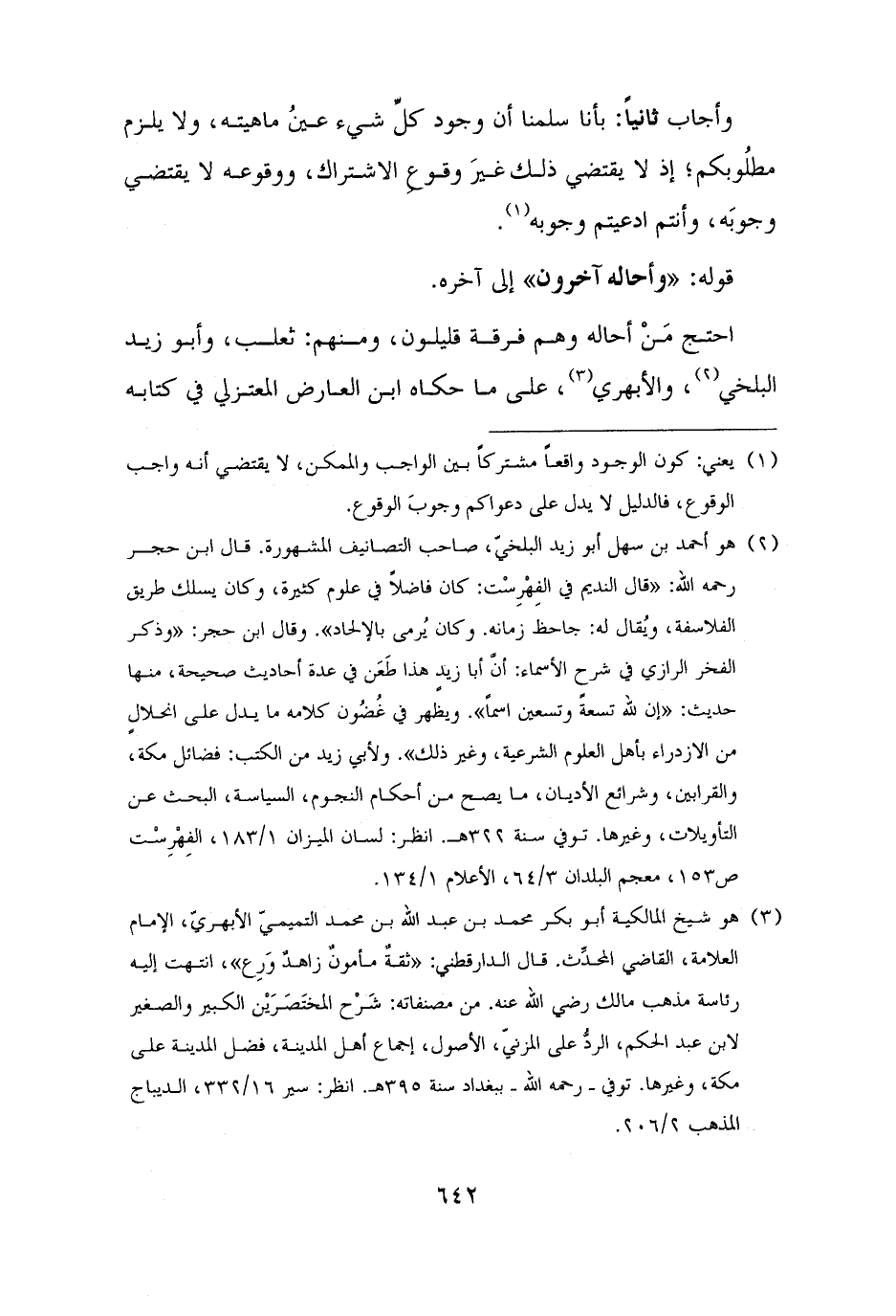 وأجاب ثانيًا: بأنا سلمنا أن وجود كلِّ شيء عينُ ماهيته، ولا يلزم مطلُوبكم؛ إذ لا يقتضي ذلك غيرَ وقوعِ الاشتراك، ووقوعه لا يقتضي وجوبَه، وأنتم ادعيتم وجوبه (¬١).
