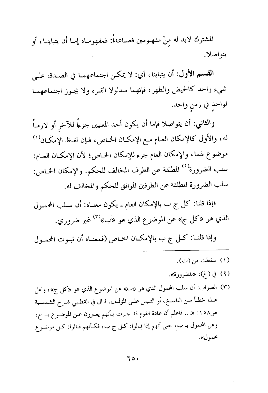 والثاني: أن يتواصلا فإما أن يكون أحد المعنيين جزءًا للآخرِ أو لازمًا له، والأول كالإمكان العام مع الإمكان الخاص، فإن لفظ الإمكان (¬١) موضوع لهما، والإمكان العام جزء للإمكان الخاص؛ لأن الإمكان العام: سلب الضرورة (¬٢) المطلقة عن الطرف المخالف للحكم. والإمكان الخاص: سلب الضرورة المطلقة عن الطرفين الموافق للحكم والمخالف له.
