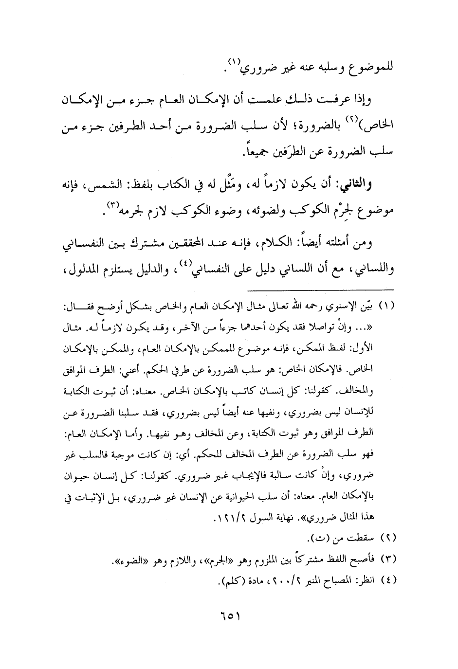 (¬١) بيّن الإسنوي رحمه الله تعالى مثال الإمكان العام والخاص بشكل أوضح فقال: ". . . وإنْ تواصلا فقد يكون أحدهما جزءًا من الآخر، وقد يكون لازمًا له. مثال الأول: لفظ الممكن، فإنه موضوع للممكن بالإمكان العام، والممكن بالإمكان الخاص. فالإمكان الخاص: هو سلب الضرورة عن طرفي الحكم. أعني: الطرف الموافق والمخالف. كقولنا: كل إنسان كاتب بالإمكان الخاص. معناه: أن ثبوت الكتابة للإنسان ليس بضروري، ونفيها عنه أيضًا ليس بضروري، فقد سلبنا الضرورة عن الطرف الموافق وهو ثبوت الكتابة، وعن المخالف وهو نفيها. وأما الإمكان العام: فهو سلب الضرورة عن الطرف المخالف للحكم. أي: إن كانت موجبة فالسلب غير ضروري، وإنْ كانت سالبة فالإيجاب غير ضروري. كقولنا: كل إنسان حيوان بالإمكان العام. معناه: أن سلب الحيوانية عن الإنسان غير ضروري، بل الإثبات في هذا المثال ضروري". نهاية السول ٢/ ١٢١.
