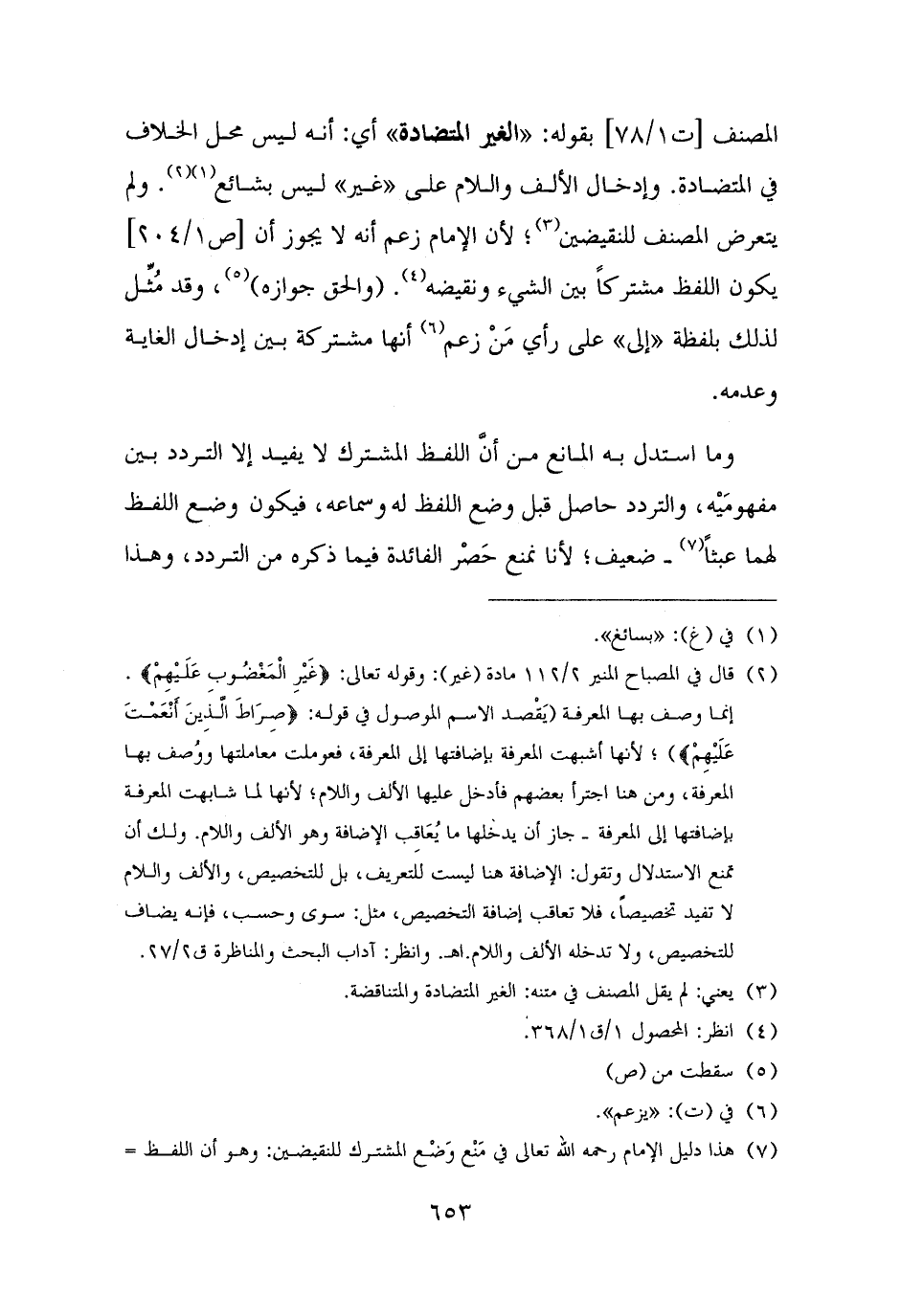 المصنف بقوله: "الغير المتضادة" أي: أنه ليس محل الخلاف في المتضادة. وإدخال الألف واللام على "غير" ليس بشائع (¬١) (¬٢). ولم يتعرض المصنف للنقيضين (¬٣)؛ لأن الإمام زعم أنه لا يجوز أن يكون اللفظ مشتركًا بين الشيء ونقيضه (¬٤). (والحق جوازه) (¬٥)، وقد مُثِّل لذلك بلفظة "إلى" على رأي مَنْ زعم (¬٦) أنها مشتركة بين إدخال الغاية وعدمه.
