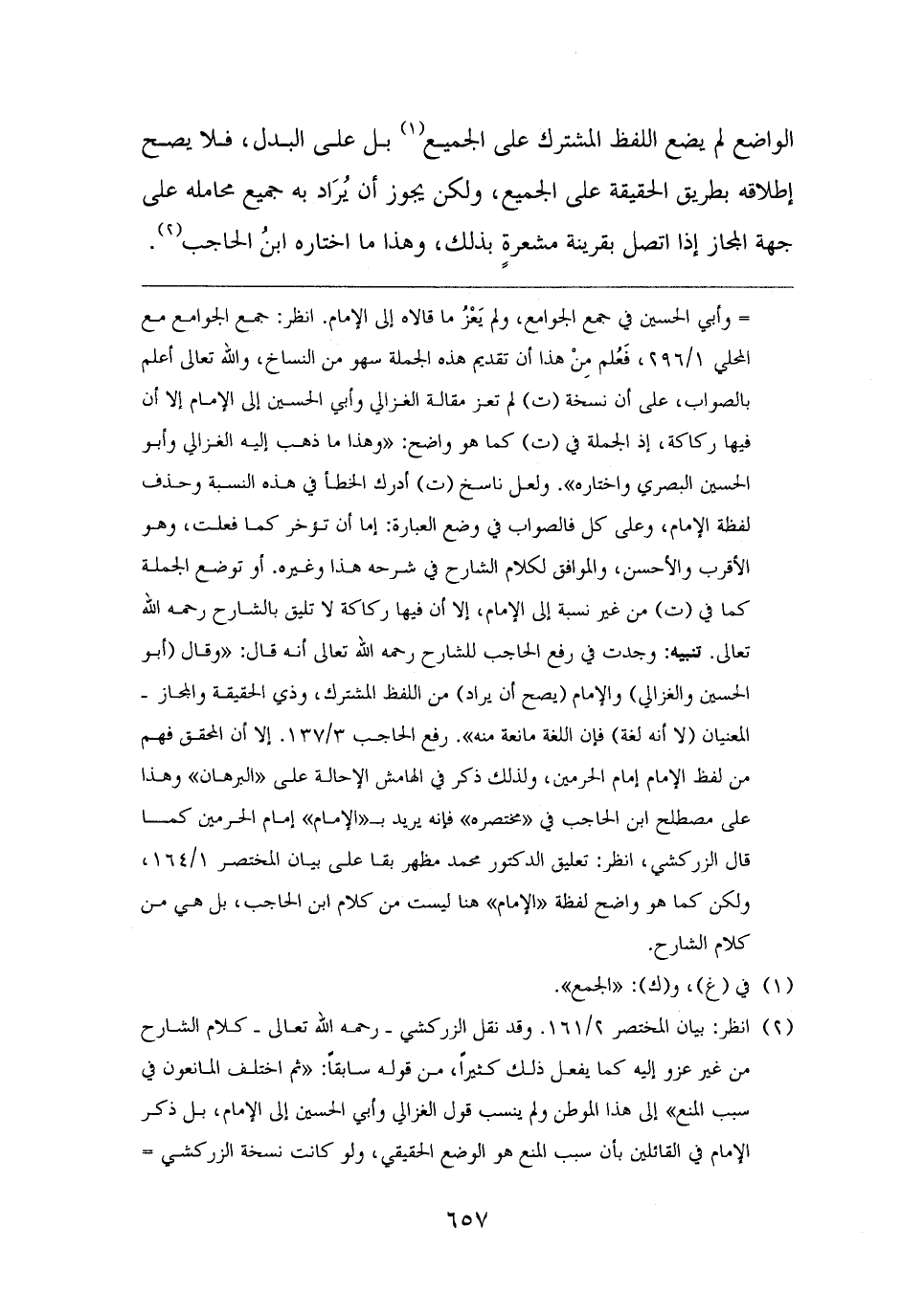 = وأبي الحسين في جمع الجوامع، ولم يَعْزُ ما قالاه إلى الإمام. انظر: جمع الجوامع مع المحلي ١/ ٢٩٦، فَعُلم مِنْ هذا أن تقديم هذه الجملة سهو من النساخ، والله تعالى أعلم بالصواب، على أن نسخة (ت) لم تعز مقالة الغزالي وأبي الحسين إلى الإمام إلا أن فيها ركاكة، إذ الجملة في (ت) كما هو واضح: "وهذا ما ذهب إليه الغزالي وأبو الحسين البصري واختاره". ولعل ناسخ (ت) أدرك الخطأ في هذه النسبة وحذف لفظة الإمام، وعلى كل فالصواب في وضع العبارة: إما أن تؤخر كما فعلت، وهو الأقرب والأحسن، والموافق لكلام الشارح في شرحه هذا وغيره. أو توضع الجملة كما في (ت) من غير نسبة إلى الإمام، إلا أن فيها ركاكة لا تليق بالشارح رحمه الله تعالى. تنبيه: وجدت في رفع الحاجب للشارح رحمه الله تعالى أنه قال: "وقال (أبو الحسين والغزالي) والإمام (يصح أن يراد) من اللفظ المشترك، وذي الحقيقة والمجاز - المعنيان (لا أنه لغة) فإن اللغة مانعة منه". رفع الحاجب ٣/ ١٣٧. إلا أن المحقق فهم من لفظ الإمام إمام الحرمين، ولذلك ذكر في الهامش الاحالة على "البرهان" وهذا على مصطلح ابن الحاجب في "مختصره" فإنه يريد بـ "الإمام" إمام الحرمين كما قال الزركشي، انظر: تعليق الدكتور محمد مظهر بقا على بيان المختصر ١/ ١٦٤، ولكن كما هو واضح لفظة "الإمام" هنا ليست من كلام ابن الحاجب، بل هي من كلام الشارح.