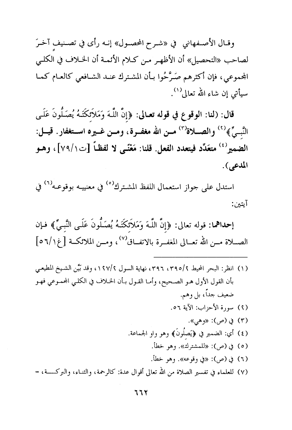 قال: (لنا: الوقوع في قوله تعالى: {إِنَّ اللَّهَ وَمَلَائِكَتَهُ يُصَلُّونَ عَلَى النَّبِيِّ} (¬٢) والصلاة (¬٣) من الله مغفرة، ومن غيره استغفار. قيل: الضمير (¬٤) متعَدِّد فيتعدد الفعل. قلنا: مَعْنًى لا لفظًا، وهو المدعى).