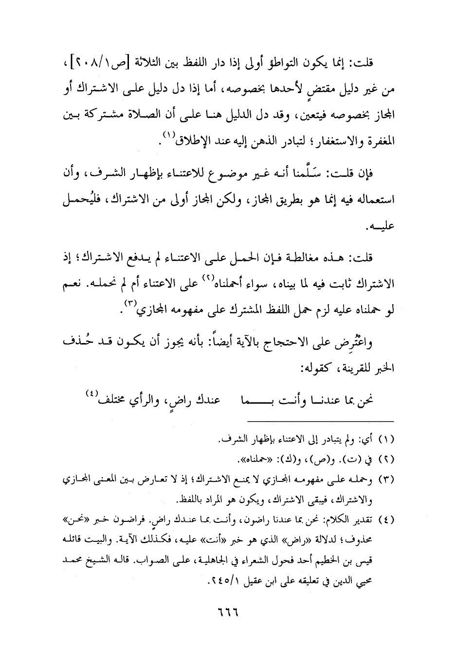 قلت: هذه مغالطة فإن الحمل على الاعتناء لم يدفع الاشتراك؛ إذ الاشتراك ثابت فيه لما بيناه، سواء أحملناه (¬٢) على الاعتناء أم لم نحمله. نعم لو حملناه عليه لزم حمل اللفظ المشترك على مفهومه المجازي (¬٣).