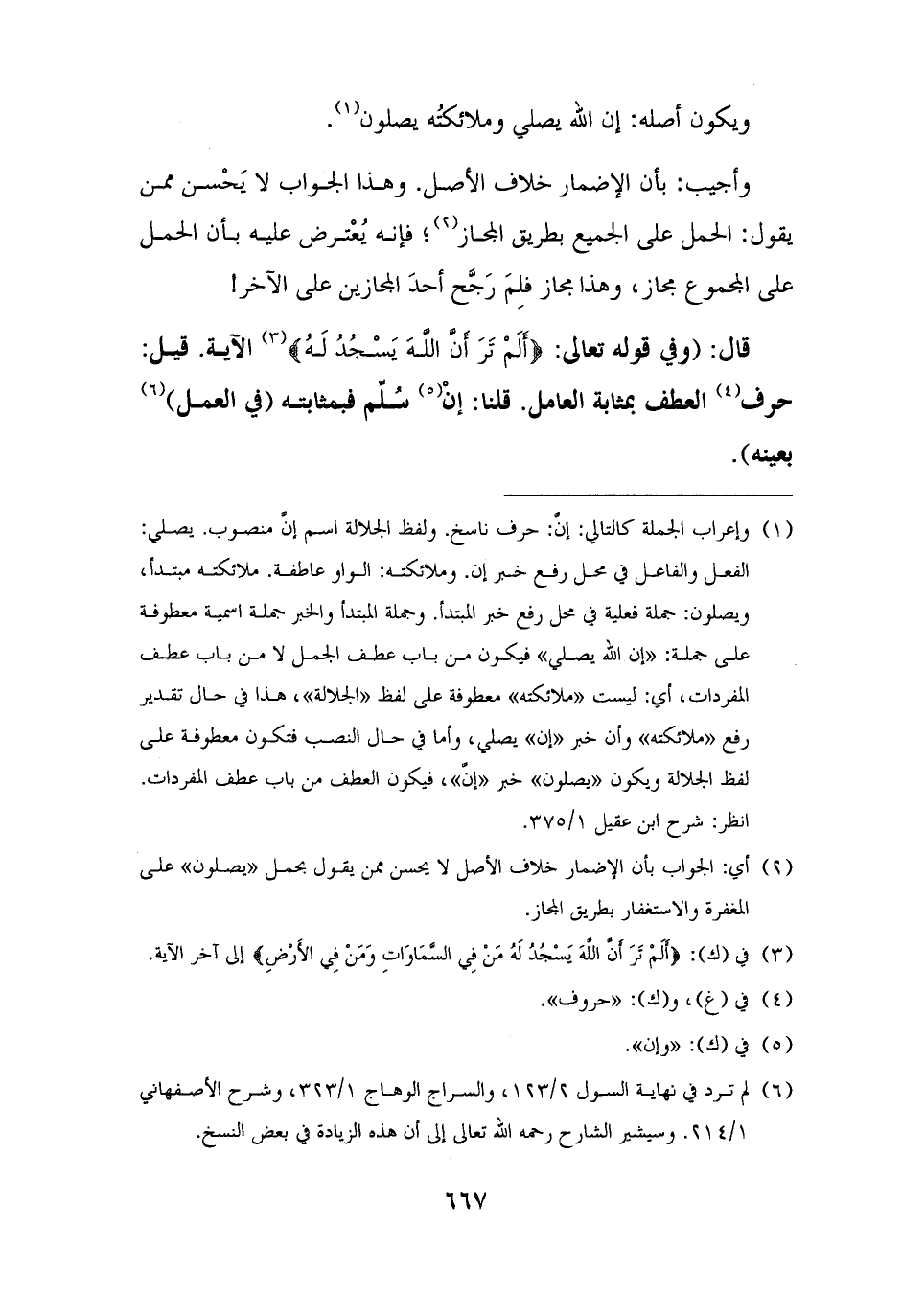 (¬١) وإعراب الجملة كالتالي: إنَّ: حرف ناسخ. ولفظ الجلالة اسم إنَّ منصوب. يصلي: الفعل والفاعل في محل رفع خبر إن. وملائكته: الواو عاطفة. ملائكته مبتدأ، ويصلون: جملة فعلية في محل رفع خبر المبتدأ. وجملة المبتدأ والخبر جملة اسمية معطوفة على جملة: "إن الله يصلي" فيكون من باب عطف الجمل لا من باب عطف المفردات، أي: ليست "ملائكته" معطوفة على لفظ "الجلالة"، هذا في حال تقدير رفع "ملائكته" وأن خبر "إن" يصلي، وأما في حال النصب فتكون معطوفة على لفظ الجلالة ويكون "يصلون" خبر "إنَّ"، فيكون العطف من باب عطف المفردات. انظر: شرح ابن عقيل ١/ ٣٧٥.