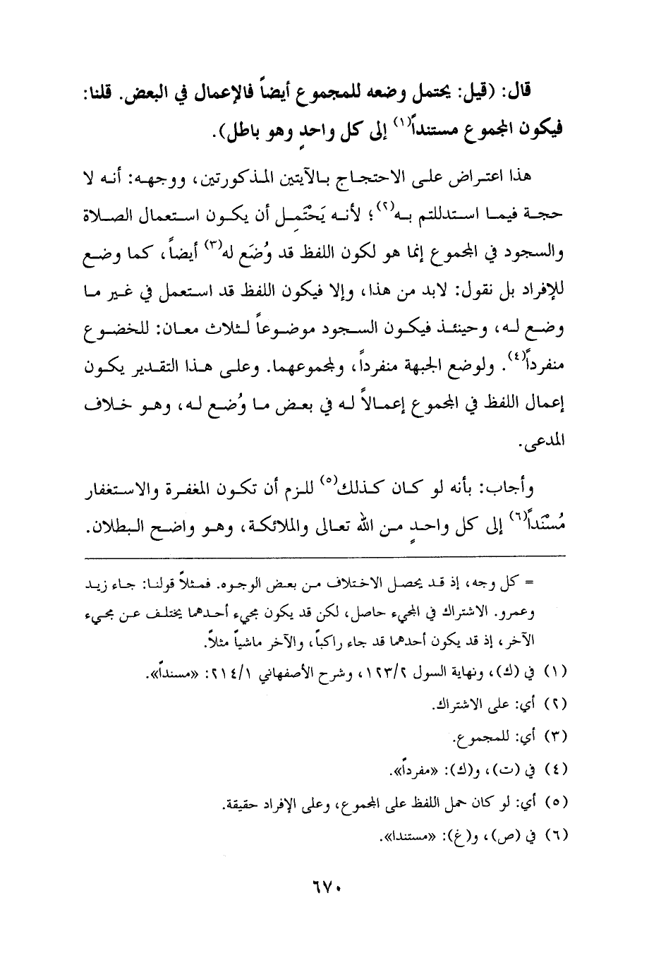 وأجاب: بأنه لو كان كذلك (¬٥) للزم أن تكون المغفرة والاستغفار مُسْنَدًا (¬٦) إلى كل واحدٍ من الله تعالى والملائكة، وهو واضح البطلان.