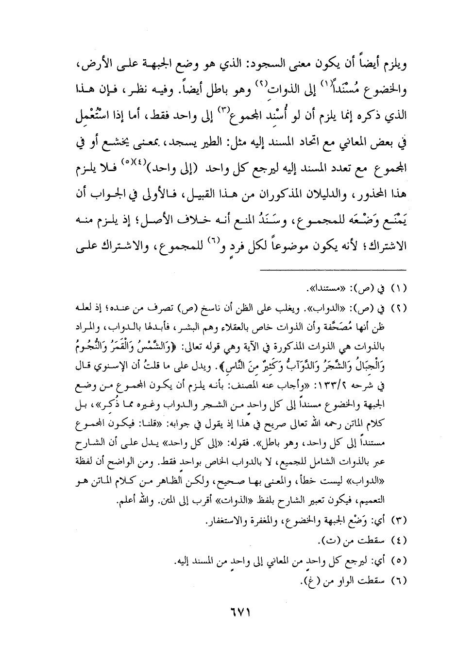 (¬٢) في (ص): "الدواب". ويغلب على الظن أن ناسخ (ص) تصرف من عنده؛ إذ لعله ظن أنها مُصَحَّفة وأن الذوات خاص بالعقلاء وهم البشر، فأبدلها بالدواب، والمراد بالذوات هي الذوات المذكورة في الآية وهي قوله تعالى: {وَالشَّمْسُ وَالْقَمَرُ وَالنُّجُومُ وَالْجِبَالُ وَالشَّجَرُ وَالدَّوَابُّ وَكَثِيرٌ مِنَ النَّاسِ}. ويدل على ما قلتُ أن الإسنوي قال في شرحه ٢/ ١٣٣: "وأجاب عنه المصنف: بأنه يلزم أن يكون المجموع من وضع الجبهة والخضوع مسندًا إلى كل واحدٍ من الشجر والدواب وغيره مما ذُكِر"، بل كلام الماتن رحمه الله تعالى صريح في هذا إذ يقول في جوابه: "قلنا: فيكون المجموع مستندًا إلى كل واحد، وهو باطل". فقوله: "إلى كل واحد" يدل على أن الشارح عبر بالذوات الشامل للجميع، لا بالدواب الخاص بواحد فقط. ومن الواضح أن لفظة "الدواب" ليست خطأ، والمعنى بها صحيح، ولكن الظاهر من كلام الماتن هو التعميم، فيكون تعبير الشارح بلفظ "الذوات" أقرب إلى المتن. والله أعلم.