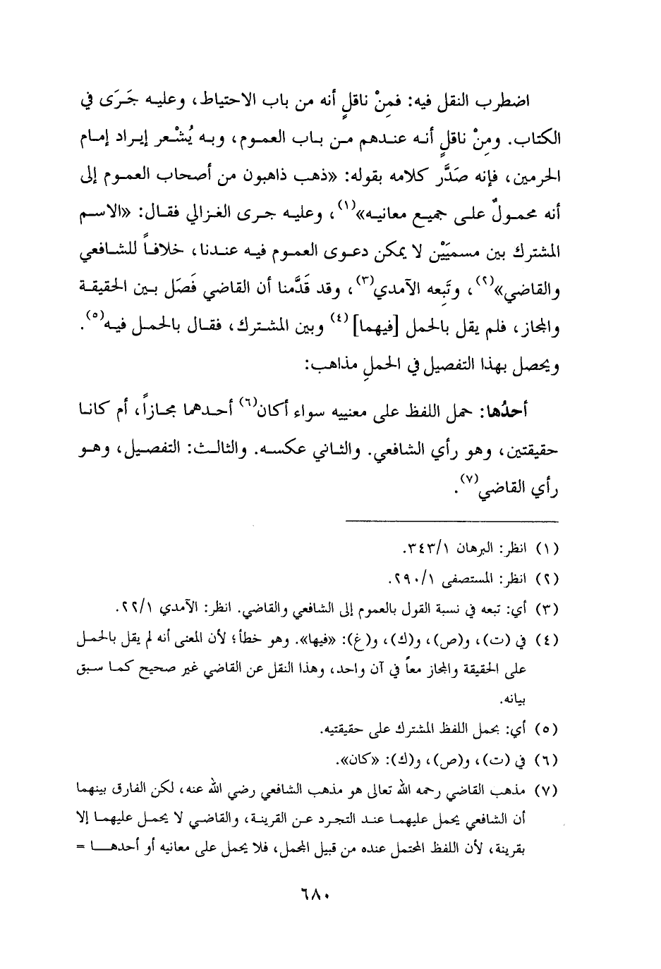 اضطرب النقل فيه: فمِنْ ناقلٍ أنه من باب الاحتياط، وعليه جَرَى في الكتاب. ومِنْ ناقلٍ أنه عندهم من باب العموم، وبه يُشْعر إيراد إمام الحرمين، فإنه صَدَّر كلامه بقوله: "ذهب ذاهبون من أصحاب العموم إلى أنه محمولٌ على حميع معانيه" (¬١)، وعليه جرى الغزالي فقال: "الاسم المشترك بين مسميَيْن لا يمكن دعوى العموم فيه عندنا، خلافًا للشافعي والقاضي" (¬٢)، وتَبِعه الآمدي (¬٣)، وقد قَدَّمنا أن القاضي فَصَل بين الحقيقة والمجاز، فلم يقل بالحمل [فيهما] (¬٤) وبين المشترك، فقال بالحمل فيه (¬٥). ويحصل بهذا التفصيل في الحملِ مذاهب: