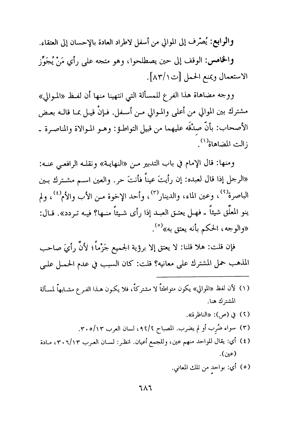 (¬١) لأن لفظ "الموالي" يكون متواطئًا لا مشتركًا، فلا يكون هذا الفرع مشابهًا لمسألة المشترك هنا.