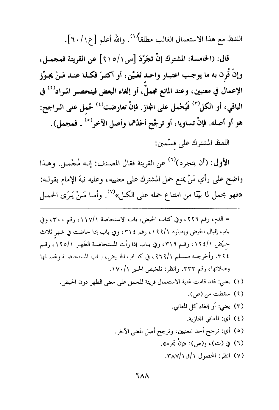 الأول: (أن يتجرد) (¬٦) عن القرينة فقال المصنف: إنه مُجْمل. وهذا واضح على رأي مَنْ يمنع حمل المشترك على معنييه، وعليه نبهَ الإمام بقوله: "فهو مجمل لما بيّنّا من امتناع حمله على الكل" (¬٧). وأما مَنْ يَرَى الحمل