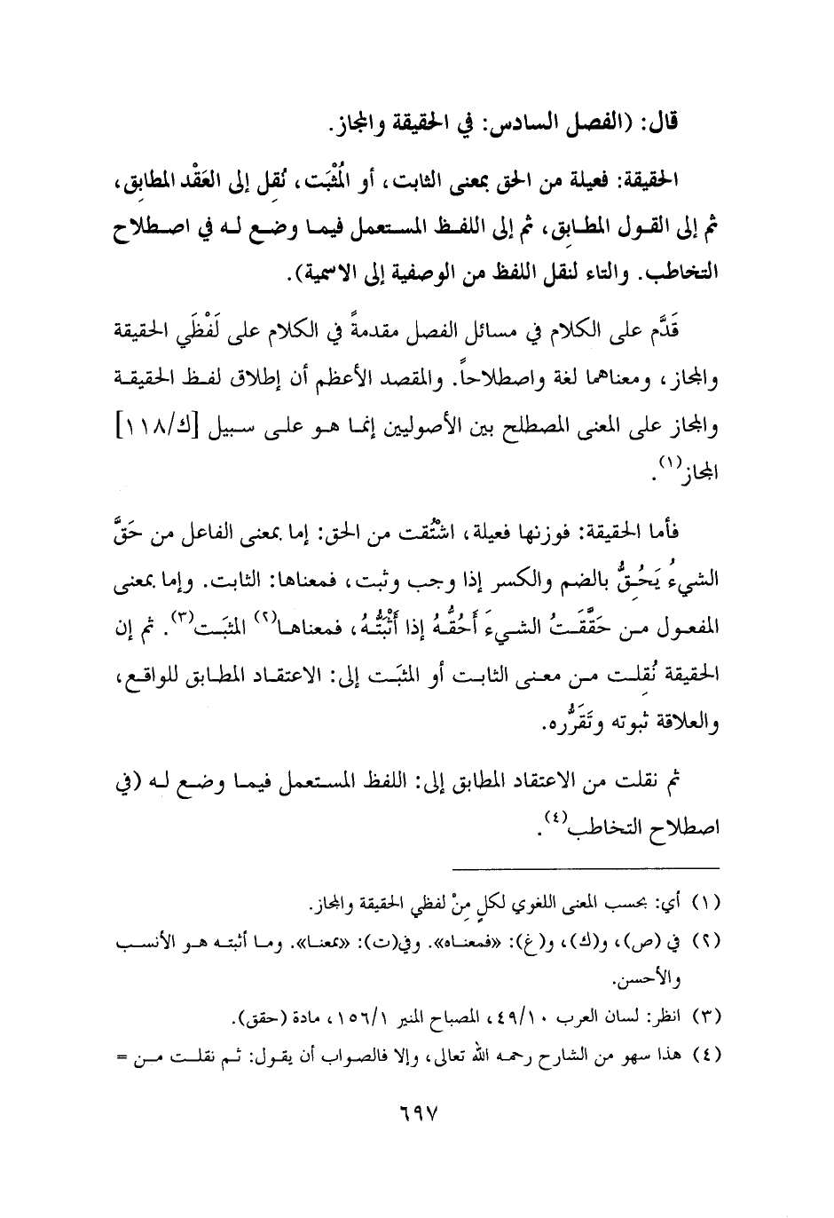 فأما الحقيقة: فوزنها فعيلة، اشْتُقت من الحق: إما بمعنى الفاعل من حَقَّ الشيءُ يَحُقُّ بالضم والكسر إذا وجب وثبت، فمعناها: الثابت. وإما بمعنى المفعول من حَقَّقتُ الشيءَ أَحُقُّهُ إذا أَثْبَتُّهُ، فمعناها (¬٢) المثبَت (¬٣). ثم إن الحقيقة نُقِلت من معنى الثابت أو المثبَت إلى: الاعتقاد المطابق للواقع، والعلاقة ثبوته وتَقَرُّره.
