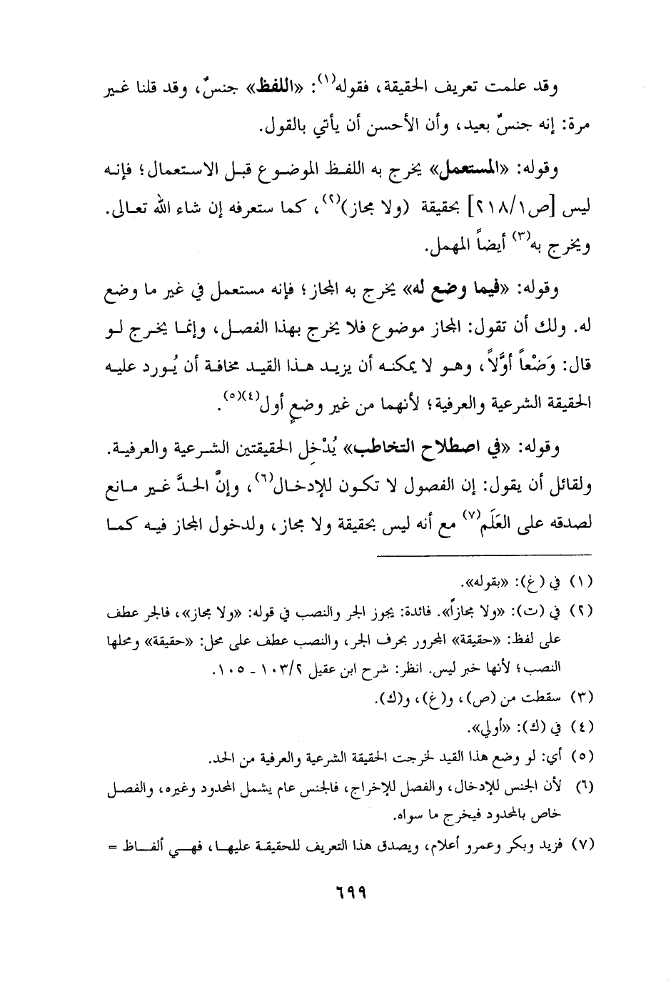 وقوله: "في اصطلاح التخاطب" يُدْخِل الحقيقتين الشرعية والعرفية. ولقائل أن يقول: إن الفصول لا تكون للإدخال (¬٦)، وإنَّ الحدَّ غير مانع لصدقه على العَلَم (¬٧) مع أنه ليس بحقيقة ولا مجاز، ولدخول المجاز فيه كما