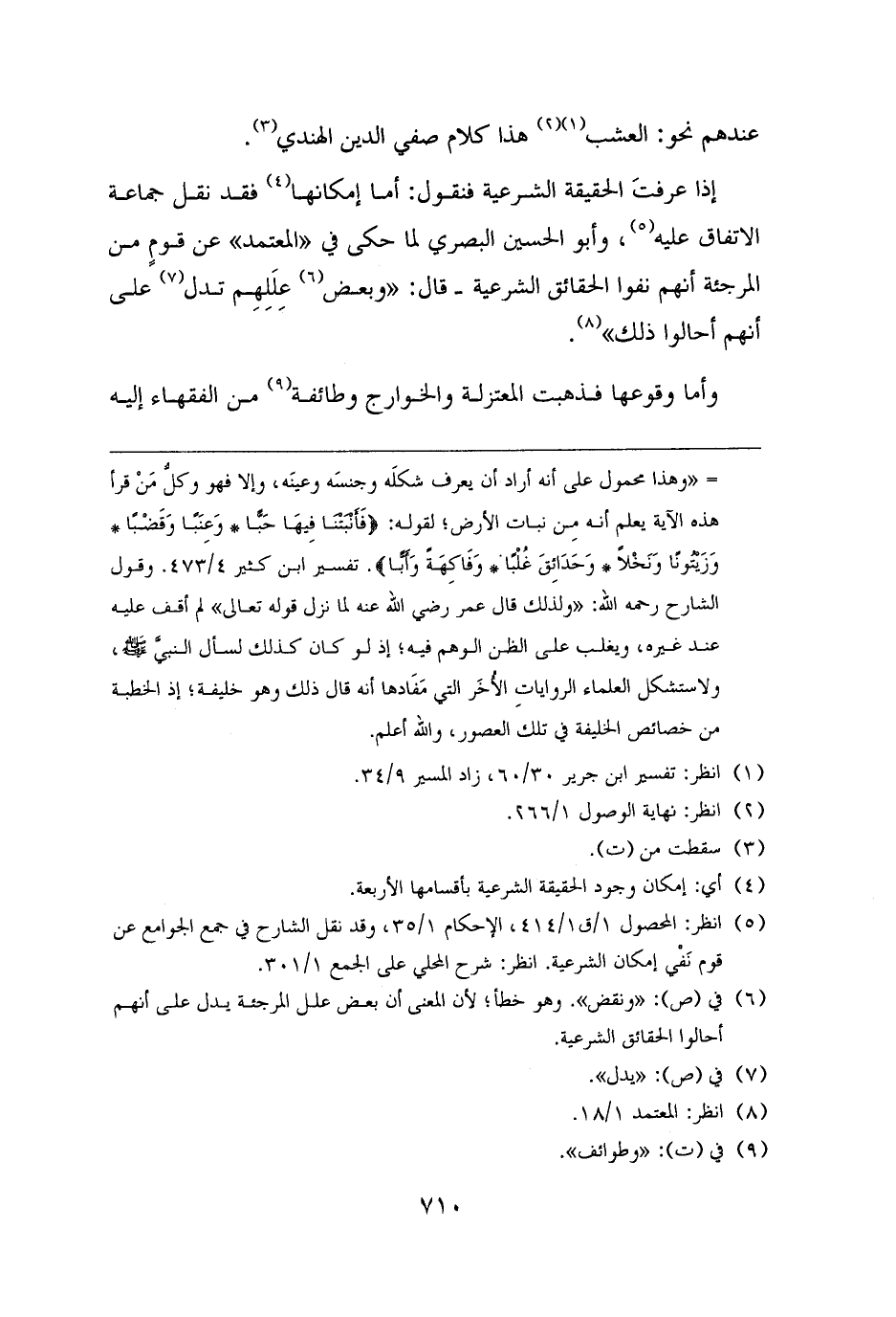 إذا عرفتَ الحقيقة الشرعية فنقول: أما إمكانها (¬٤) فقد نقل جماعة الاتفاق عليه (¬٥)، وأبو الحسين البصري لما حكى في "المعتمد" عن قومٍ من المرجئة أنهم نفوا الحقائق الشرعية - قال: "وبعض (¬٦) عِلَلِهِم تدل (¬٧) على أنهم أحالوا ذلك" (¬٨).