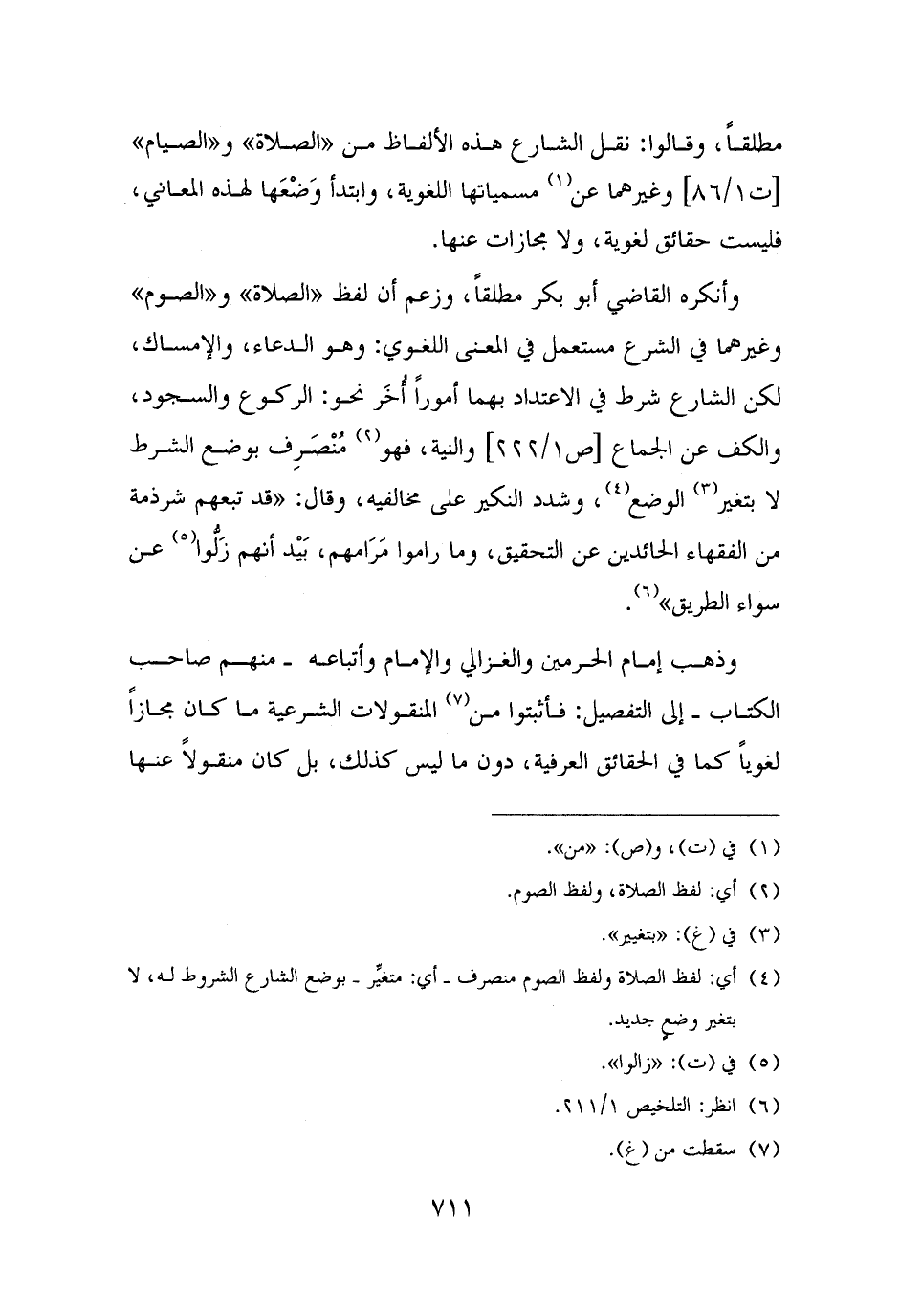 وأنكره القاضي أبو بكر مطلقًا، وزعم أن لفظ "الصلاة" و"الصوم" وغيرهما في الشرع مستعمل في المعنى اللغوي: وهو الدعاء، والإمساك، لكن الشارع شرط في الاعتداد بهما أمورًا أُخَر نحو: الركوع والسجود، والكف عن الجماع والنية، فهو (¬٢) مُنْصَرِف بوضع الشرط لا بتغير (¬٣) الوضع (¬٤)، وشدد النكير على مخالفيه، وقال: "قد تبعهم شرذمة من الفقهاء الحائدين عن التحقيق، وما راموا مَرَامهم، بَيْد أنهم زَلُّوا (¬٥) عن سواء الطريق" (¬٦).