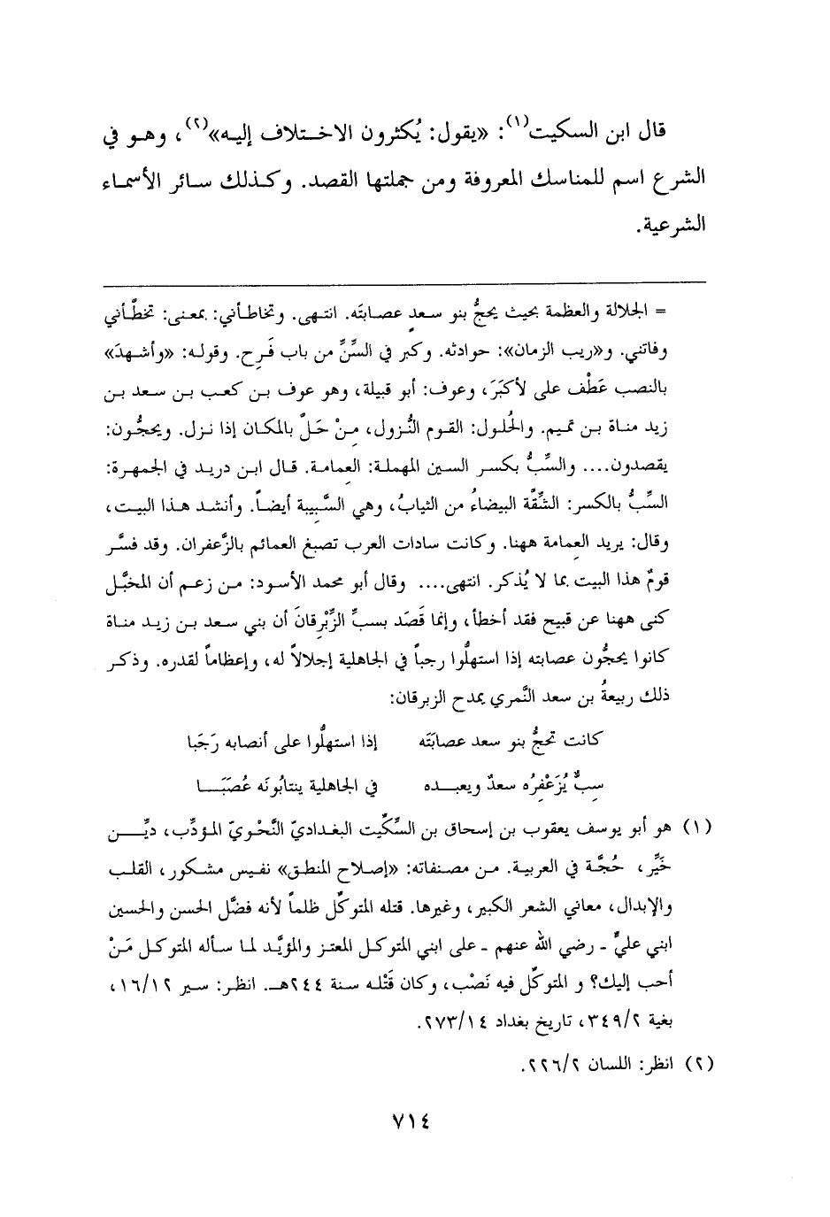 (¬١) هو أبو يوسف يعقوب بن إسحاق بن السِّكِّيت البغداديّ النَّحْويّ المؤدِّب، ديِّن خَيِّر، حُجَّة في العربية. من مصنفاته: "إصلاح المنطق" نفيس مشكور، القلب والإبدال، معاني الشعر الكبير، وغيرها. قتله المتوكِّل ظلمًا لأنه فضَّل الحسن والحسين ابني عليٍّ - رضي الله عنهم - على ابني المتوكل المعتز والمؤيَّد لما سأله المتوكل مَنْ أحب إليك؟ والمتوكِّل فيه نَصْب، وكان قَتْله سنة ٢٤٤ هـ. انظر: سير ١٢/ ١٦، بغية ٢/ ٣٤٩، تاريخ بغداد ١٤/ ٢٧٣.