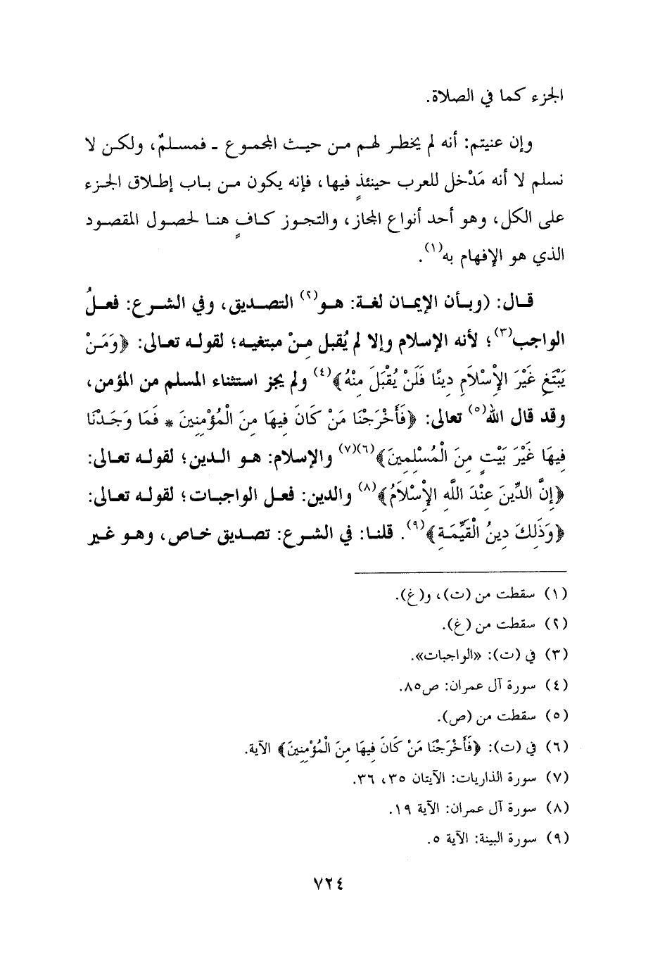 قال: (وبأن الإيمان لغة: هو (¬٢) التصديق، وفي الشرع: فعلُ الواجب (¬٣)؛ لأنه الإسلام وإلا لم يُقبل مِنْ مبتغيه؛ لقوله تعالى: {وَمَنْ يَبْتَغِ غَيْرَ الْإِسْلَامِ دِينًا فَلَنْ يُقْبَلَ مِنْهُ} (¬٤) ولم يجز استثناء المسلم من المؤمن، وقد قال الله (¬٥) تعالى: {فَأَخْرَجْنَا مَنْ كَانَ فِيهَا مِنَ الْمُؤْمِنِينَ (٣٥) فَمَا وَجَدْنَا فِيهَا غَيْرَ بَيْتٍ مِنَ الْمُسْلِمِينَ} (¬٦) (¬٧) والإسلام: هو الدين؛ لقوله تعالى: {إِنَّ الدِّينَ عِنْدَ اللَّهِ الْإِسْلَامُ} (¬٨) والدين: فعل الواجبات؛ لقوله تعالى: {وَذَلِكَ دِينُ الْقَيِّمَةِ} (¬٩). قلنا: في الشرع: تصديق خاص، وهو غير