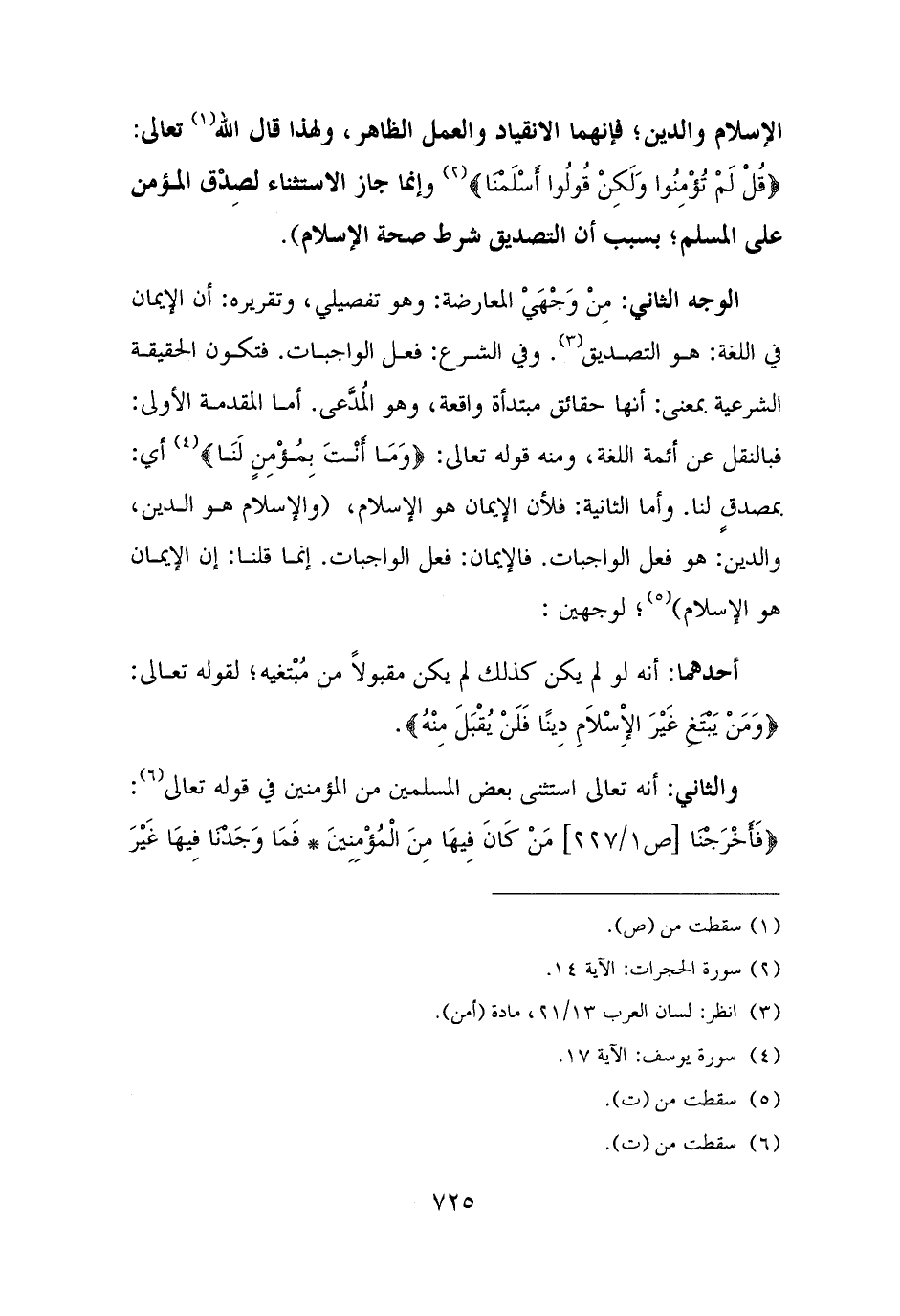 الإسلام والدين؛ فإنهما الانقياد والعمل الظاهر، ولهذا قال الله (¬١) تعالى: {قُلْ لَمْ تُؤْمِنُوا وَلَكِنْ قُولُوا أَسْلَمْنَا} (¬٢) وإنما جاز الاستثناء لصِدْق المؤمن على المسلم؛ بسبب أن التصديق شرط صحة الإسلام).