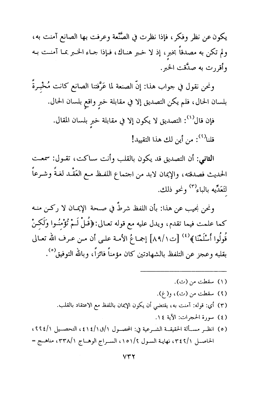 ونحن نقول في جواب هذا: إنّ الصنعة لما عَرَّفتنا الصانع كانت مُخْبِرةً بلسان الحال، فلم يكن التصديق إلا في مقابلة خبرٍ واقعٍ بلسان الحال.