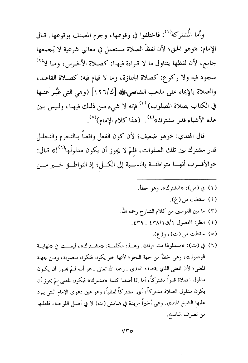 (¬٦) في (ت): "مدلولها مشترك". وهذه الكلمة: "مشترك"، ليست في "نهاية الوصول"، وهي خطأ من جهة النحو؛ لأنها خبر يكون فتكون منصوبة، ومن جهة المعنى؛ لأن المعنى الذي يقصده الهندى - رحمه الله تعالى - هو أنه لِمَ يجوز أن يكون مدلول الصلاة قدرًا مشتركًا، ) ما إذا اً ضفنا كلمة "مشترك" فيكونَ المعنى لِمَ يجوز أن يكون مدلول الصلاة مشتركًا، أي: مشتركًا لفظيًا، وهو عين دعوى الإمام التي يرد عليها الشيخ الهندي. وهي أخيرًا مزيدة في هامش (ت) لا في أصل اللوحة، فلعلها من تصرف الناسخ.