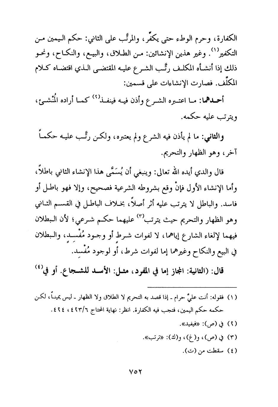 قال والدي أيده الله تعالى: وينبغي أن يُسَمَّى هذا الإنشاء الثاني باطلًا، وأما الإنشاء الأول فإنْ وقع بشروطه الشرعية فصحيح، وإلا فهو باطل أو فاسد. والباطل لا يترتب عليه أثر أصلًا، بخلاف الباطل في القسم الثاني وهو الظهار والتحريم حيث يترتب (¬٣) عليهما حكم شرعي؛ لأن البطلان فيهما لإلغاء الشارع إياهما، لا لفوات شرطٍ أو وجود مُفْسِدٍ، والبطلان في البيع والنكاح وغيرهما إما لفوات شرط، أو لوجود مُفْسِد.