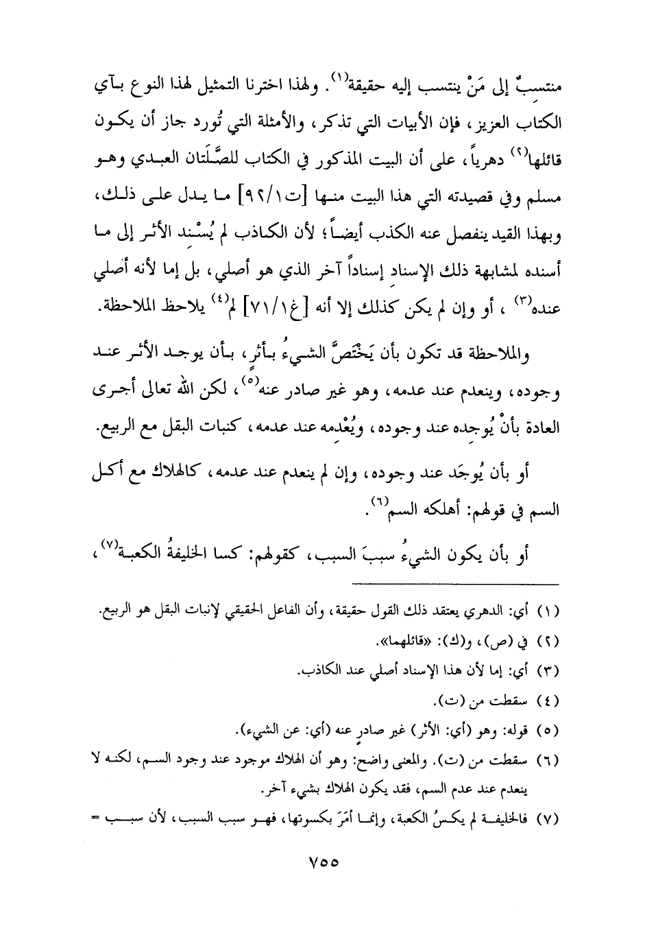 منتسِبٌ إلى مَنْ ينتسب إليه حقيقة (¬١). ولهذا اخترنا التمثيل لهذا النوع بآي الكتاب العزيز، فإن الأبيات التي تذكر، والأمثلة التي تُورد جاز أن يكون قائلها (¬٢) دهريًا، على أن البيت المذكور في الكتاب للصَّلَتان العبدي وهو مسلم وفي قصيدته التي هذا البيت منها ما يدل على ذلك، وبهذا القيد ينفصل عنه الكذب أيضًا؛ لأن الكاذب لم يُسْنِد الأثر إلى ما أسنده لمشابهة ذلك الإسنادِ إسنادًا آخر الذي هو أصلي، بل إما لأنه أصلي عنده (¬٣)، أو وإن لم يكن كذلك إلا أنه لم (¬٤) يلاحظ الملاحظة.
