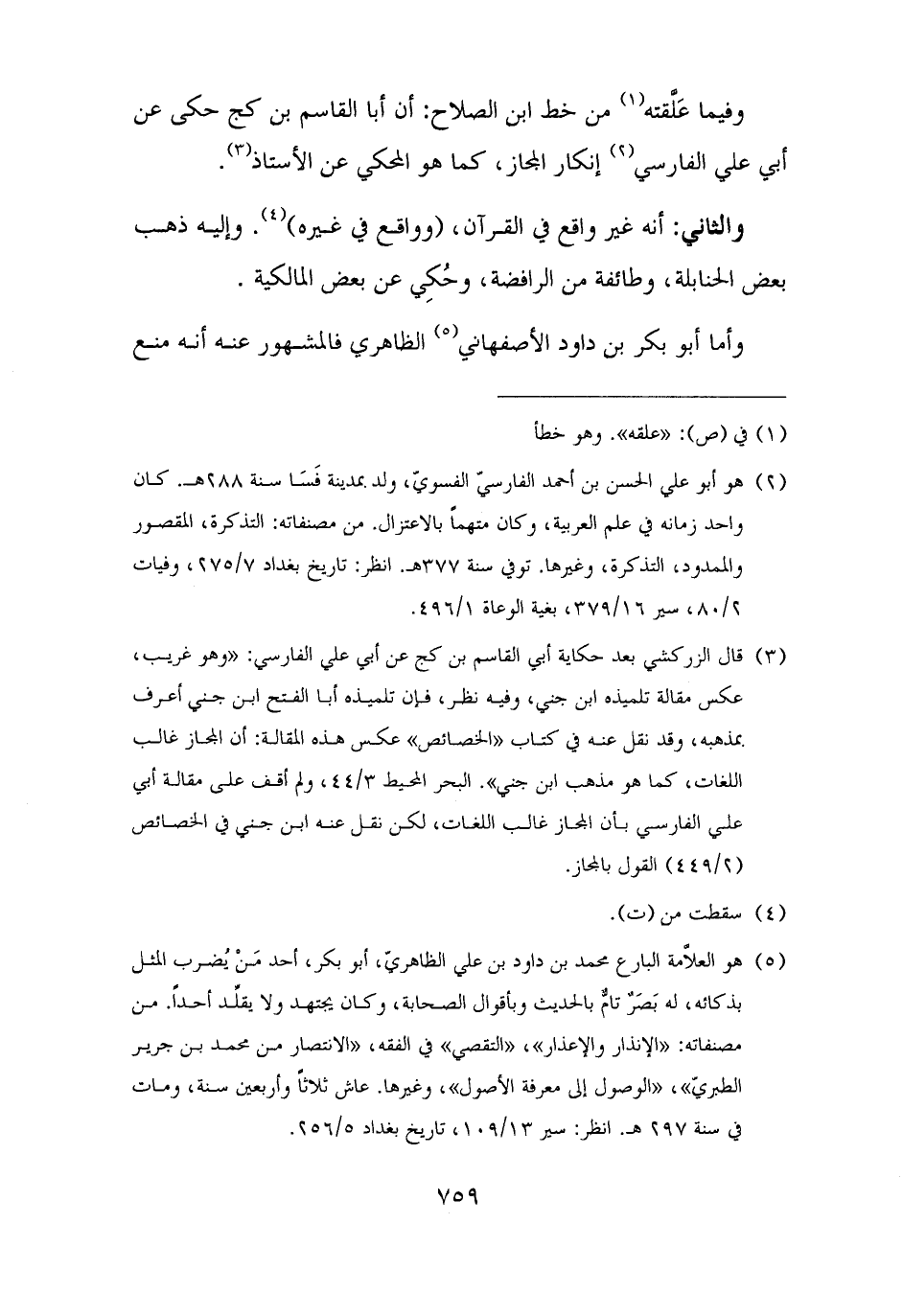 (¬٣) قال الزركشي بعد حكاية أبي القاسم بن كج عن أبي علي الفارسي: "وهو غريب، عكس مقالة تلميذه ابن جني، وفيه نظر، فإن تلميذه أبا الفتح ابن جني أعرف بمذهبه، وقد نقل عنه في كتاب "الخصائص" عكس هذه المقالة: أن المجاز غالب اللغات، كما هو مذهب ابن جني". البحر المحيط ٣/ ٤٤، ولم أقف على مقالة أبي علي الفارسي بأن المجاز غالب اللغات، لكن نقل عنه ابن جني في الخصائص (٢/ ٤٤٩) القول بالمجاز.