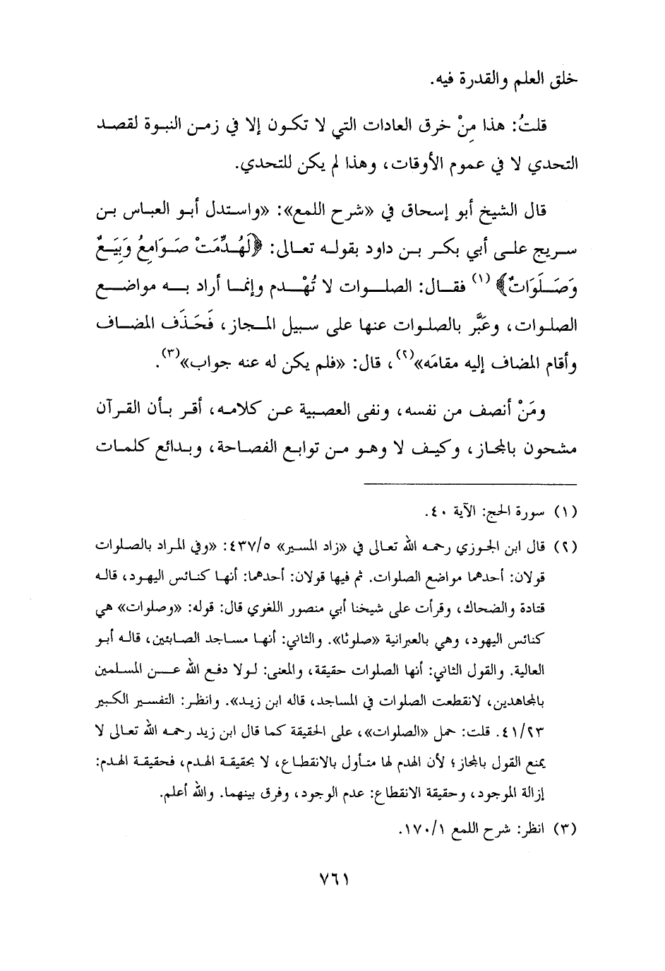 (¬٢) قال ابن الجوزي رحمه الله تعالى في "زاد المسير" ٥/ ٤٣٧: "وفي المراد بالصلوات قولان: أحدهما مواضع الصلوات. ثم فيها قولان: أحدهما: أنها كنائس اليهود، قاله قتادة والضحاك، وقرأت على شيخنا أبي منصور اللغوي قال: قوله: "وصلوات" هي كنائس اليهود، وهي بالعبرانية "صلوثا". والثاني: أنها مساجد الصابئين، قاله أبو العالية. والقول الثاني: أنها الصلوات حقيقة، والمعنى: لولا دفع الله عن المسلمين بالمجاهدين، لانقطعت الصلوات في المساجد، قاله ابن زيد". وانظر: التفسير الكبير ٢٣/ ٤١. قلت: حمل "الصلوات"، على الحقيقة كما قال ابن زيد رحمه الله تعالى لا يمنع القول بالمجاز؛ لأن الهدم لها متأول بالانقطاع، لا بحقيقة الهدم، فحقيقة الهدم: إزالة الموجود، وحقيقة الانقطاع: عدم الوجود، وفرق بينهما. والله أعلم.