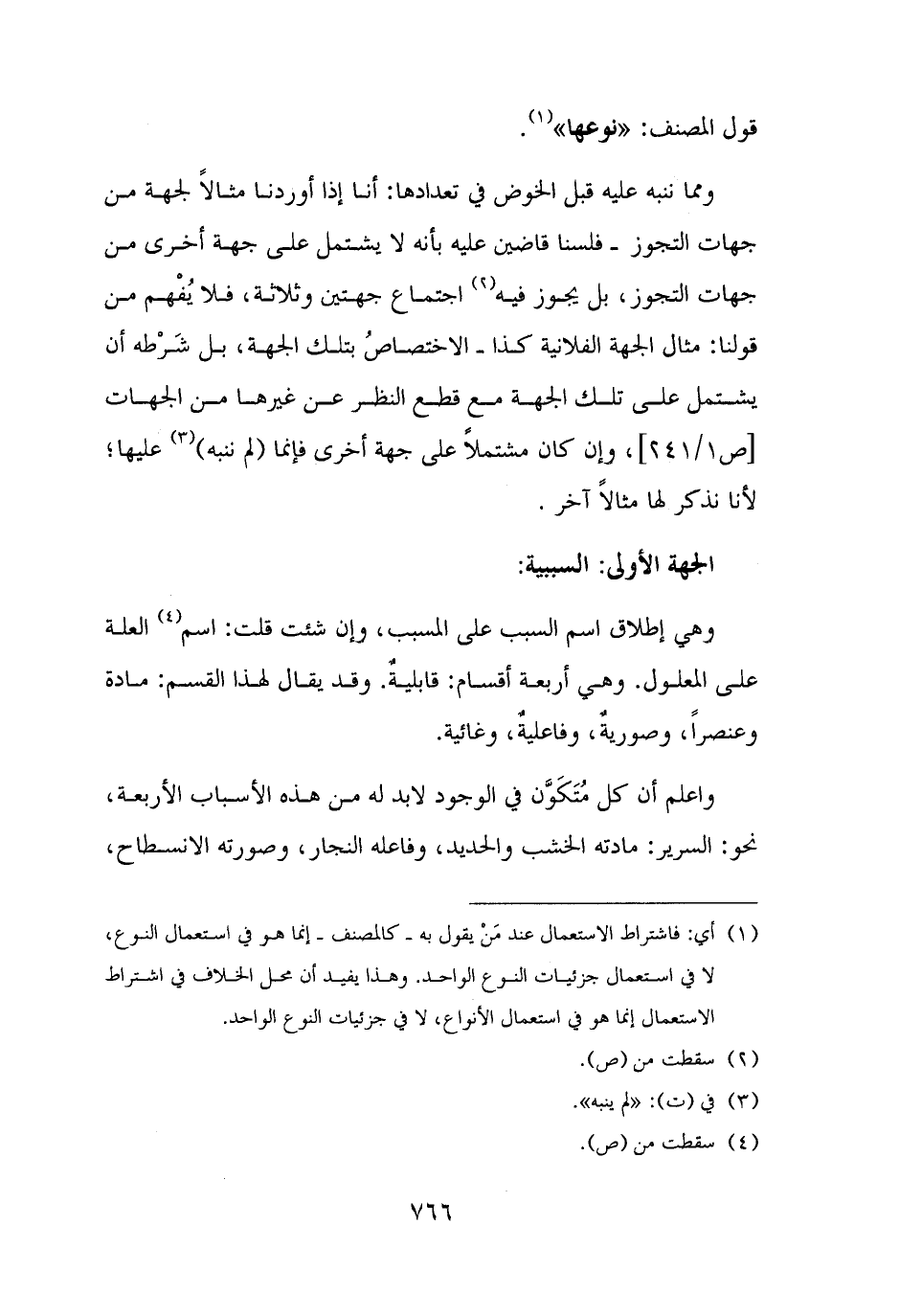 واعلم أن كل مُتَكَوَّن في الوجود لا بد له من هذه الأسباب الأربعة، نحو: السرير: مادته الخشب والحديد، وفاعله النجار، وصورته الانسطاح،