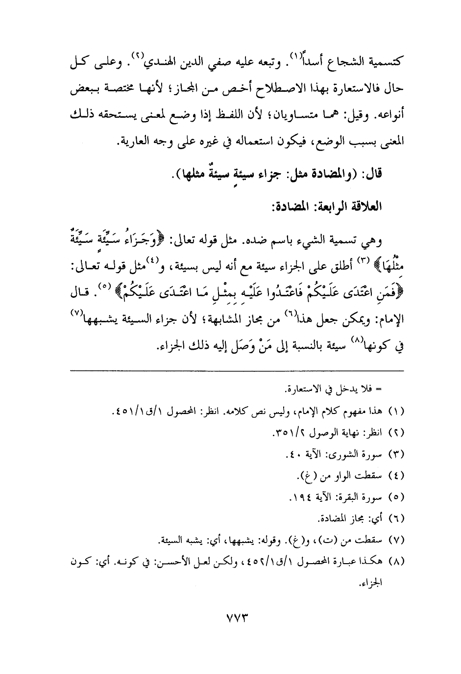 وهي تسمية الشيء باسم ضده. مثل قوله تعالى: {وَجَزَاءُ سَيِّئَةٍ سَيِّئَةٌ مِثْلُهَا} (¬٣) أطلق على الجزاء سيئة مع أنه ليس بسيئة، و (¬٤) مثل قوله تعالى: {فَمَنِ اعْتَدَى عَلَيْكُمْ فَاعْتَدُوا عَلَيْهِ بِمِثْلِ مَا اعْتَدَى عَلَيْكُمْ} (¬٥). قال الإمام: ويمكن جعل هذا (¬٦) من مجاز المشابهة؛ لأن جزاء السيئة يشبهها (¬٧) في كونها (¬٨) سيئة بالنسبة إلى مَنْ وَصَل إليه ذلك الجزاء.