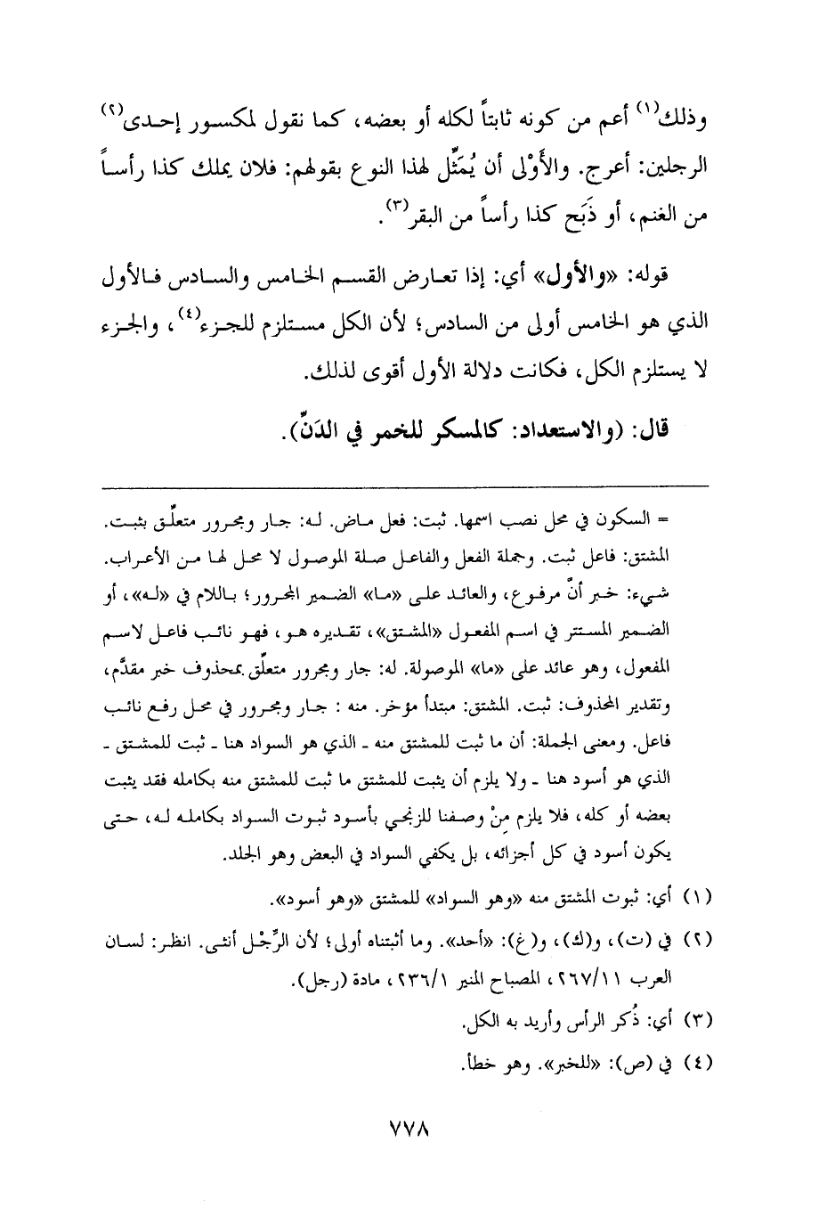 وذلك (¬١) أعم من كونه ثابتًا لكله أو بعضه، كما نقول لمكسور إحدى (¬٢) الرجلين: أعرج. والأَوْلى أن يُمَثِّل لهذا النوع بقولهم: فلان يملك كذا رأسًا من الغنم، أو ذَبَح كذا رأسًا من البقر (¬٣).