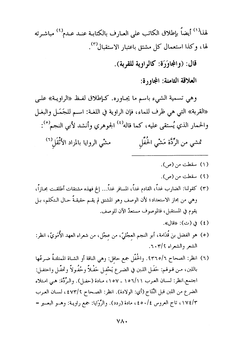 وهي تسمية الشيء باسم ما يجاوره. كإطلاق لفظ "الراوية" على "القربة" التي هي ظرف للماء، فإن الراوية في اللغة: اسم للجَمَل والبغل والحمار الذي يُستقى عليه، كما قاله (¬٤) الجوهري وأنشد لأبي النجم (¬٥):