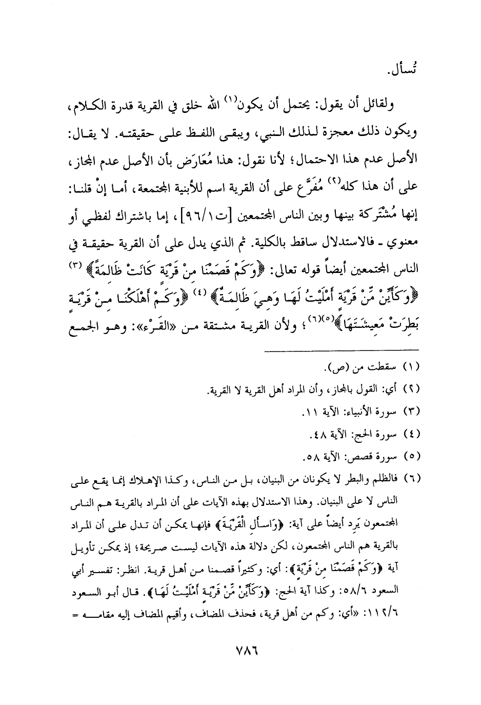 ولقائل أن يقول: يحتمل أن يكون (¬١) الله خلق في القرية قدرة الكلام، ويكون ذلك معجزة لذلك النبي، ويبقى اللفظ على حقيقته. لا يقال: الأصل عدم هذا الاحتمال؛ لأنا نقول: هذا مُعَارَض بأن الأصل عدم المجاز، على أن هذا كله (¬٢) مُفَرَّع على أن القرية السم للأبنية المجتمعة، أما إنْ قلنا: إنها مُشْتَركة بينها وبين الناس المجتمعين، إما باشتراك لفظي أو معنوي - فالاستدلال ساقط بالكلية. ثم الذي يدل على أن القرية حقيقة في الناس المجتمعين أيضًا قوله تعالى: {وَكَمْ قَصَمْنَا مِنْ قَرْيَةٍ كَانَتْ ظَالِمَةً} (¬٣) {وَكَأَيِّنْ مِنْ قَرْيَةٍ أَمْلَيْتُ لَهَا وَهِيَ ظَالِمَةٌ} (¬٤) {وَكَمْ أَهْلَكْنَا مِنْ قَرْيَةٍ بَطِرَتْ مَعِيشَتَهَا} (¬٥) (¬٦)؛ ولأن القرية مشتقة من "القَرْء": وهو الجمع