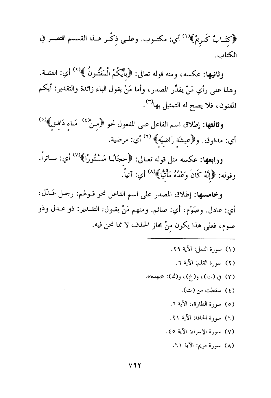وثانيها: عكسه، ومنه قوله تعالى: {بِأَيِّكُمُ الْمَفْتُونُ} (¬٢) أي: الفتنة. وهذا على رأي مَنْ يقدِّر المصدر، وأما مَنْ يقول الباء زائدة والتقدير: أيكم المفتون، فلا يصح له التمثيل بها (¬٣).