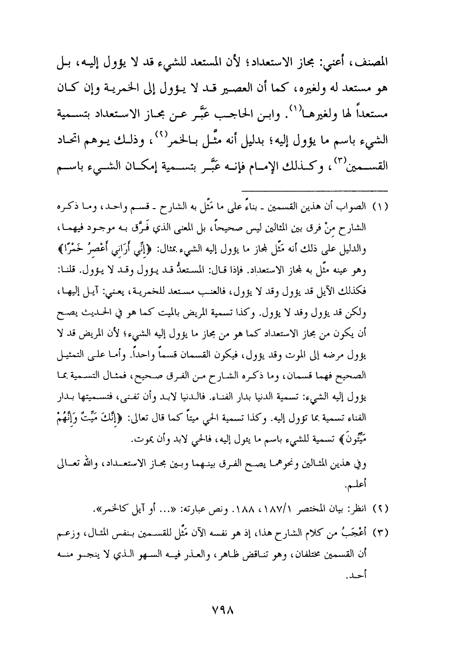 المصنف، أعني: مجاز الاستعداد؛ لأن المستعد للشيء قد لا يؤول إليه، بل هو مستعد له ولغيره، كما أن العصير قد لا يؤول إلى الخمرية وإن كان مستعدًا لها ولغيرها (¬١). وابن الحاجب عَبَّر عن مجاز الاستعداد بتسمية الشيء باسم ما يؤول إليه؛ بدليل أنه مثَّل بالخمر (¬٢)، وذلك يوهم اتحاد القسمين (¬٣)، وكذلك الإمام فإنه عَبَّر بتسمية إمكان الشيء باسم