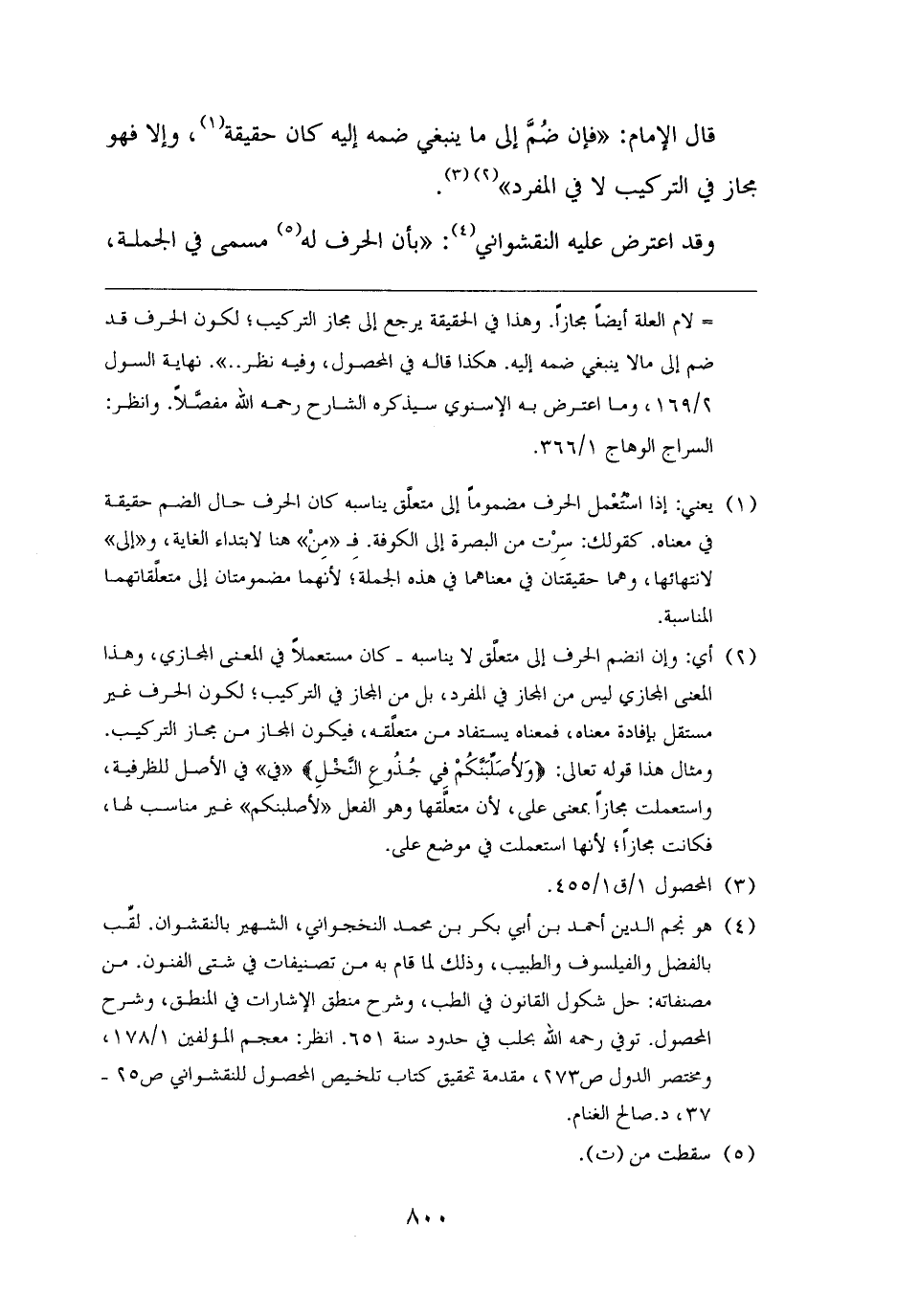 وقد اعترض عليه النقشواني (¬٤): "بأن الحرف له (¬٥) مسمى في الجملة،
