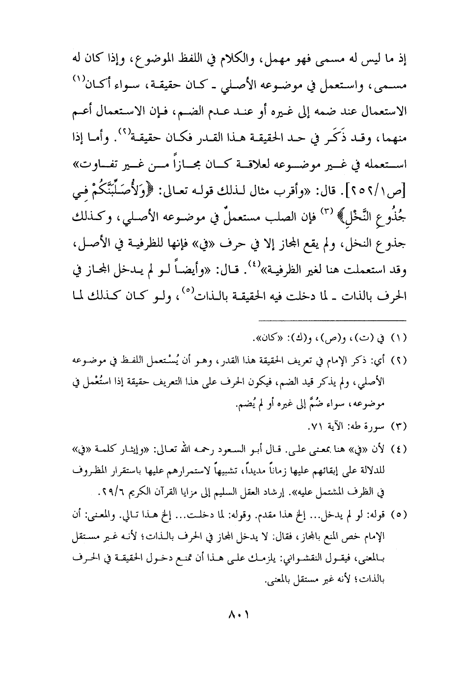 إذ ما ليس له مسمى فهو مهمل، والكلام في اللفظ الموضوع، وإذا كان له مسمى، واستعمل في موضوعه الأصلي - كان حقيقة، سواء أكان (¬١) الاستعمال عند ضمه إلى غيره أو عند عدم الضم، فإن الاستعمال أعم منهما، وقد ذَكَر في حد الحقيقة هذا القدر فكان حقيقة (¬٢). وأما إذا استعمله في غير موضوعه لعلاقة كان مجازًا من غير تفاوت". قال: "وأقرب مثال لذلك قوله تعالى: {وَلَأُصَلِّبَنَّكُمْ فِي جُذُوعِ النَّخْلِ} (¬٣) فإن الصلب مستعملٌ في موضوعه الأصلي، وكذلك جذوع النخل، ولم يقع المجاز إلا في حرف "في" فإنها للظرفية في الأصل، وقد استعملت هنا لغير الظرفية" (¬٤). قال: "وأيضًا لو لم يدخل المجاز في الحرف بالذات - لما دخلت فيه الحقيقة بالذات (¬٥)، ولو كان كذلك لما