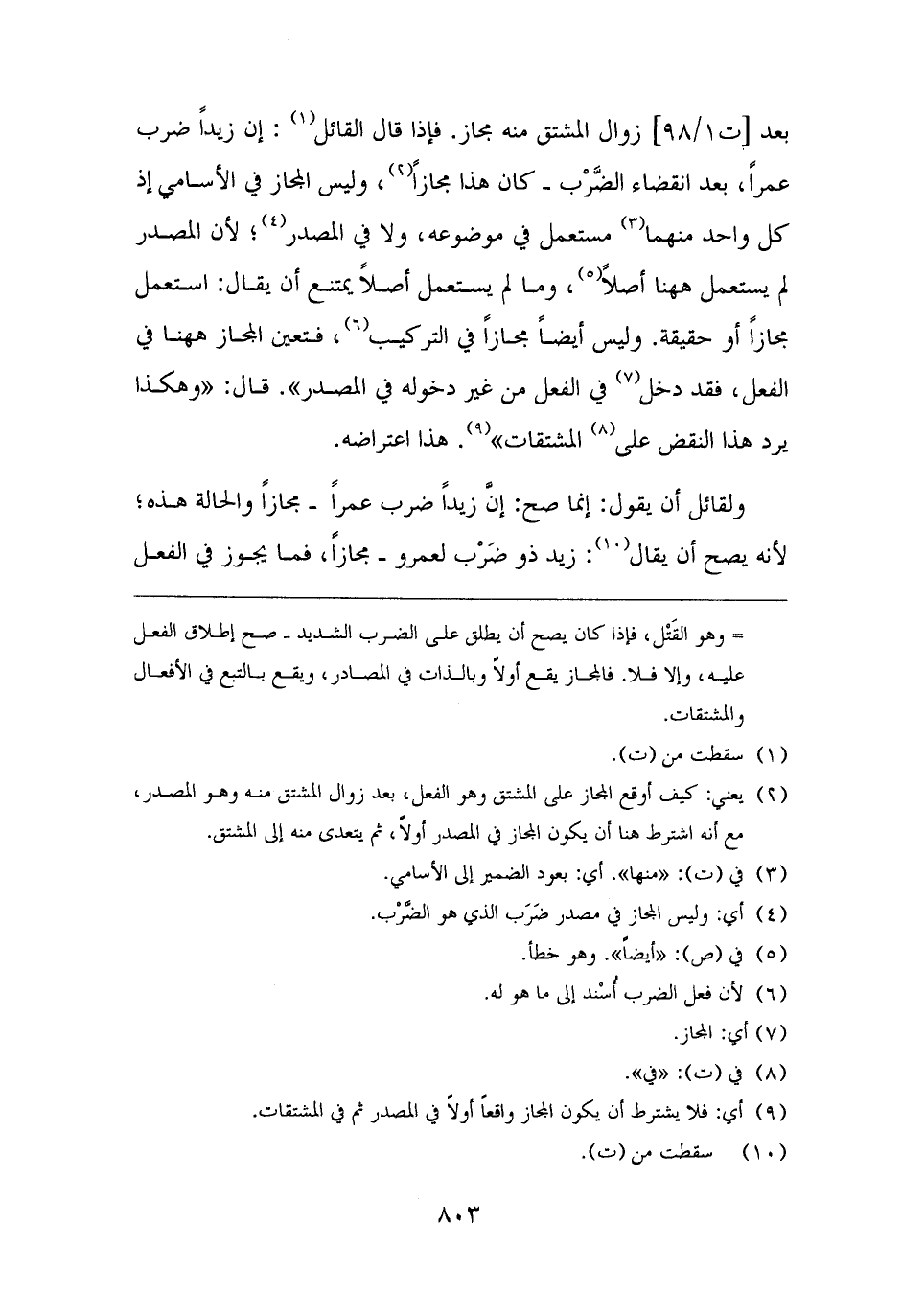 بعد زوال المشتق منه مجاز. فإذا قال القائل (¬١): إن زيدًا ضرب عمرًا، بعد انقضاء الضَّرْب - كان هذا مجازًا (¬٢)، وليس المجاز في الأسامي إذ كل واحد منهما (¬٣) مستعمل في موضوعه، ولا في المصدر (¬٤)؛ لأن المصدر لم يستعمل ههنا أصلًا (¬٥)، وما لم يستعمل أصلًا يمتنع أن يقال: استعمل مجازًا أو حقيقة. وليس أيضًا مجازًا في التركيب (¬٦)، فتعين المجاز ههنا في الفعل، فقد دخل (¬٧) في الفعل من غير دخوله في المصدر". قال: "وهكذا يرد هذا النقض على (¬٨) المشتقات" (¬٩). هذا اعتراضه.