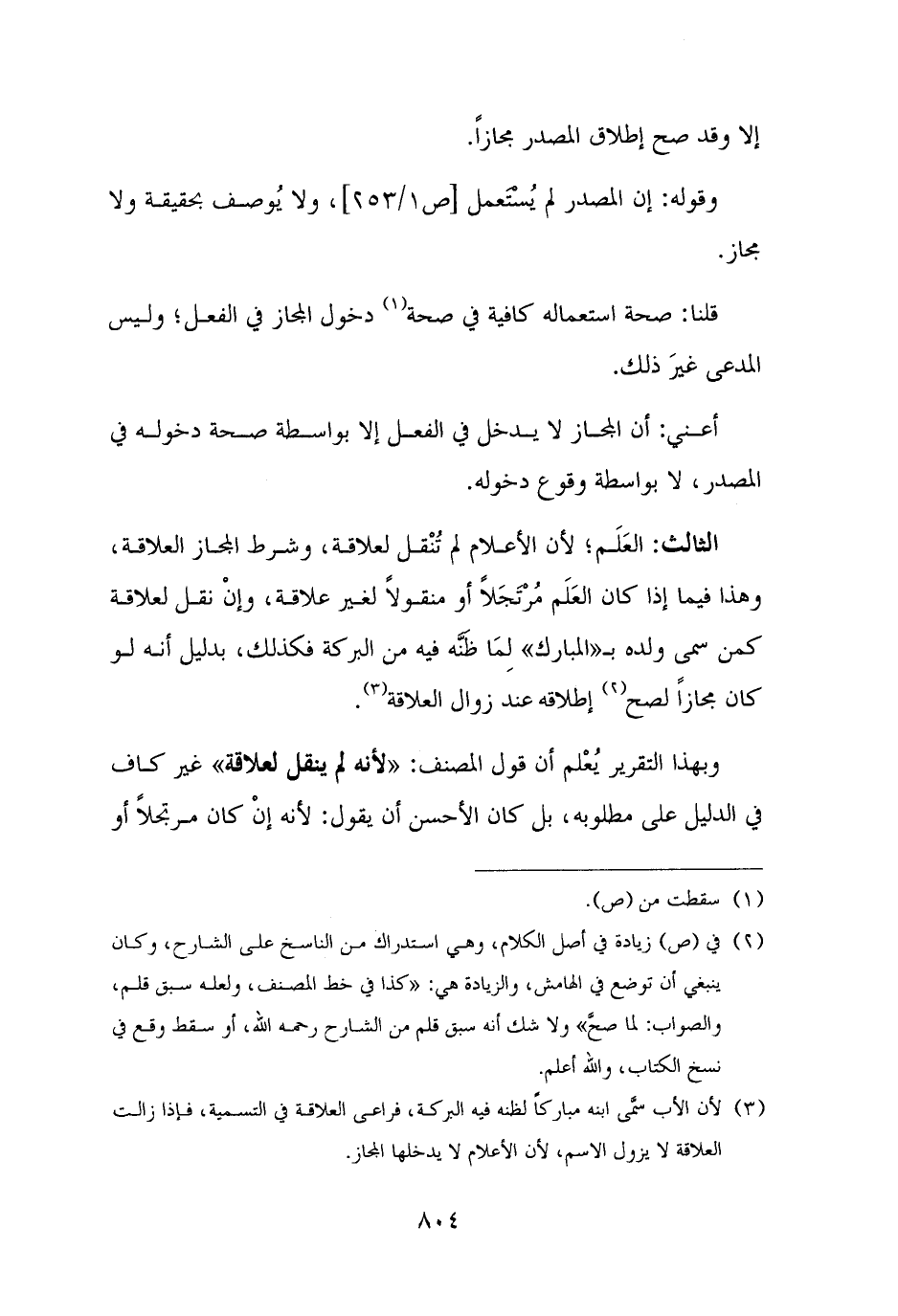 (¬٣) لأن الأب سمَّى ابنه مباركًا لظنه فيه البركة، فراعى العلاقة في التسمية، فإذا زالت العلاقة لا يزول الاسم, لأن الأعلام لا يدخلها المجاز.