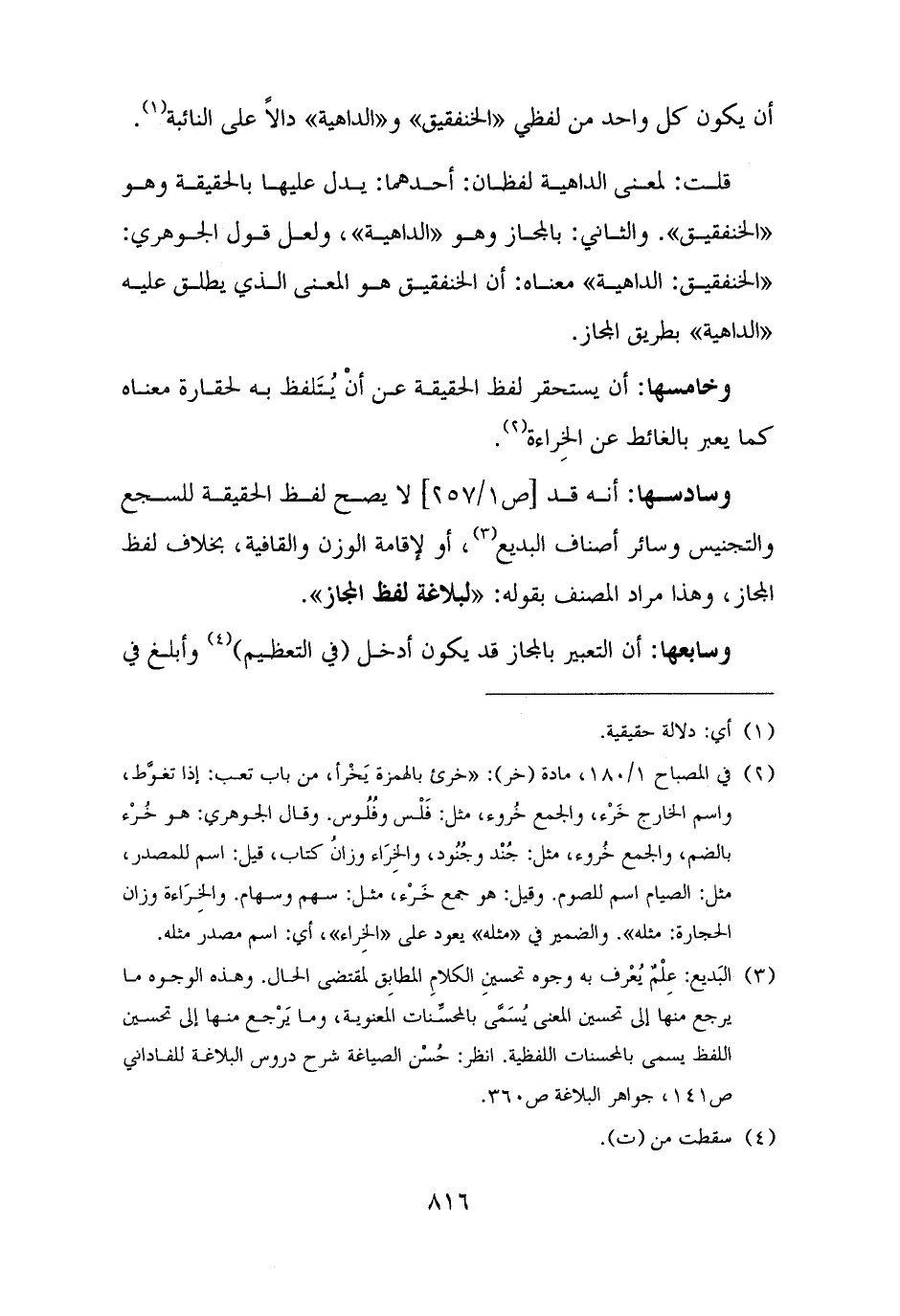 قلت: لمعنى الداهية لفظان: أحدهما: يدل عليها بالحقيقة وهو "الخنفقيق". والثاني: بالمجاز وهو "الداهية"، ولعل قول الجوهري: "الخنفقيق: الداهية" معناه: أن الخنفقيق هو المعنى الذي يطلق عليه "الداهية" بطريق المجاز.