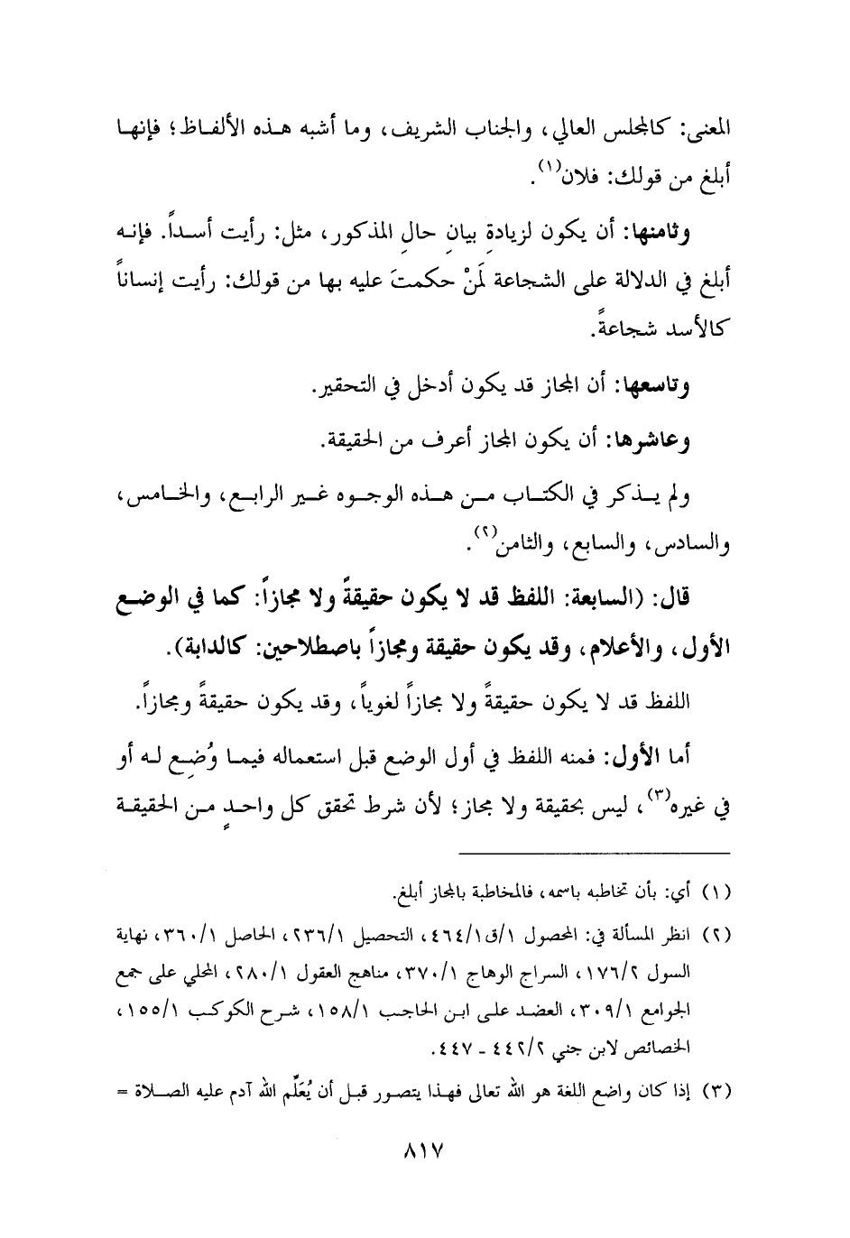 المعنى: كالمجلس العالي، والجناب الشريف، وما أشبه هذه الألفاظ؛ فإنها أبلغ من قولك: فلان (¬١).